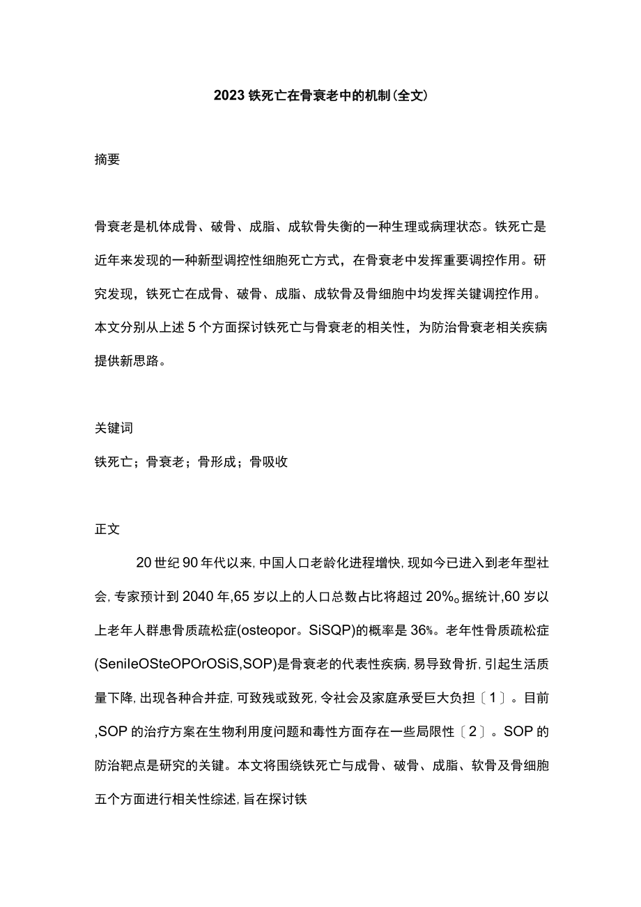 2、质疏松症(SeniIeOSteOPOrOSiS,SOP)是骨衰老的代表性疾病,易导致骨折,引起生活质量下降,出现各种合并症,可致残或致死,令社会及家庭承受巨大负担1。目前,SOP的治疗方案在生物利用度问题和毒性方面存在一些局限性2。SOP的防治靶点是研究的关键。本文将围绕铁死亡与成骨、破骨、成脂、软骨及骨细胞五个方面进行相关性综述,旨在探讨铁死亡与骨衰老之间的关系,为骨衰老相关疾病提供新思路。1骨衰老的含义衰老是人体自然生长过程中不可避免的生理或病理过程。骨组织是人体最先衰老的组织,骨衰老是指随着年龄的增长,表现为骨密度下降的一种骨丢失。成骨细胞介导骨形成、破骨细胞介导骨吸收、脂肪细胞介导脂肪