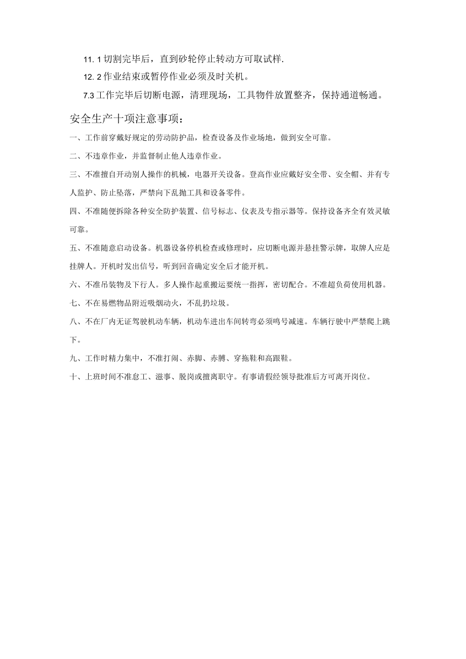 2、查润滑油情况,及时清除油污并加注润滑油。5 .2.3机体内的积屑污物要经常清除。5.切割机的安全注意事项5. 1穿好工作服,带好防护镜,女工将头发盘起来。6. 2不得切割未夹紧的小工件。7. 3不得进行强力切割操作,在切割前要使电机达到全速。8. 4切割机工作时,左侧禁止人员停留。9. 5发现有不正常声音,应立刻停机检查。6、应急情况处理6.1如遇紧急情况,先关机断电,人员受伤及时上报公司送医治疗。10. 2发生伤害事故,保护现场,找出原因,及时整改。7、操作后的收尾11. 1切割完毕后,直到砂轮停止转动方可取试样.12. 2作业结束或暂停作业必须及时关机。7.3工作完毕后切断电源,清理现场,