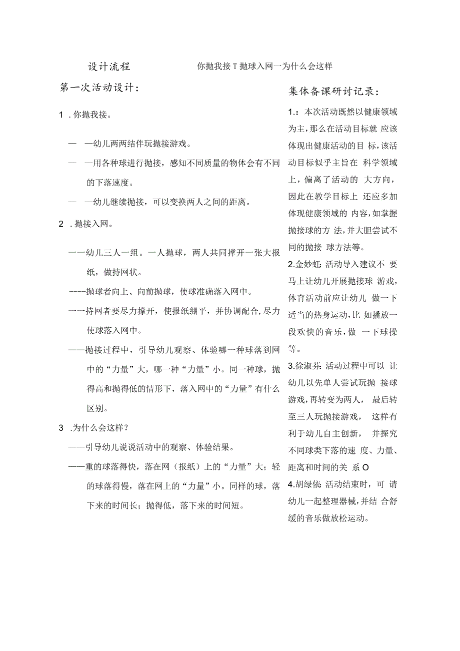 3、、体验哪一种球落到网中的“力量”大,哪一种“力量”小。同一种球,抛得高和抛得低的情形下,落入网中的“力量”有什么区别。3 .为什么会这样?引导幼儿说说活动中的观察、体验结果。集体备课研讨记录:1 .:本次活动既然以健康领域为主,那么在活动目标就 应该体现出健康活动的目 标,该活动目标似乎主旨在 科学领域上,偏离了活动的 大方向,因此在教学目标上 还应多加体现健康领域的 内容,如掌握抛接球的方 法,并大胆尝试不同的抛接 球方法等。2 .金妙虹:活动导入建议不 要马上让幼儿开展抛接球 游戏,体育活动前应让幼儿 做一下适当的热身运动,比 如播放一段欢快的音乐,做 一下球操等。3 .徐淑芬:活动过程中
