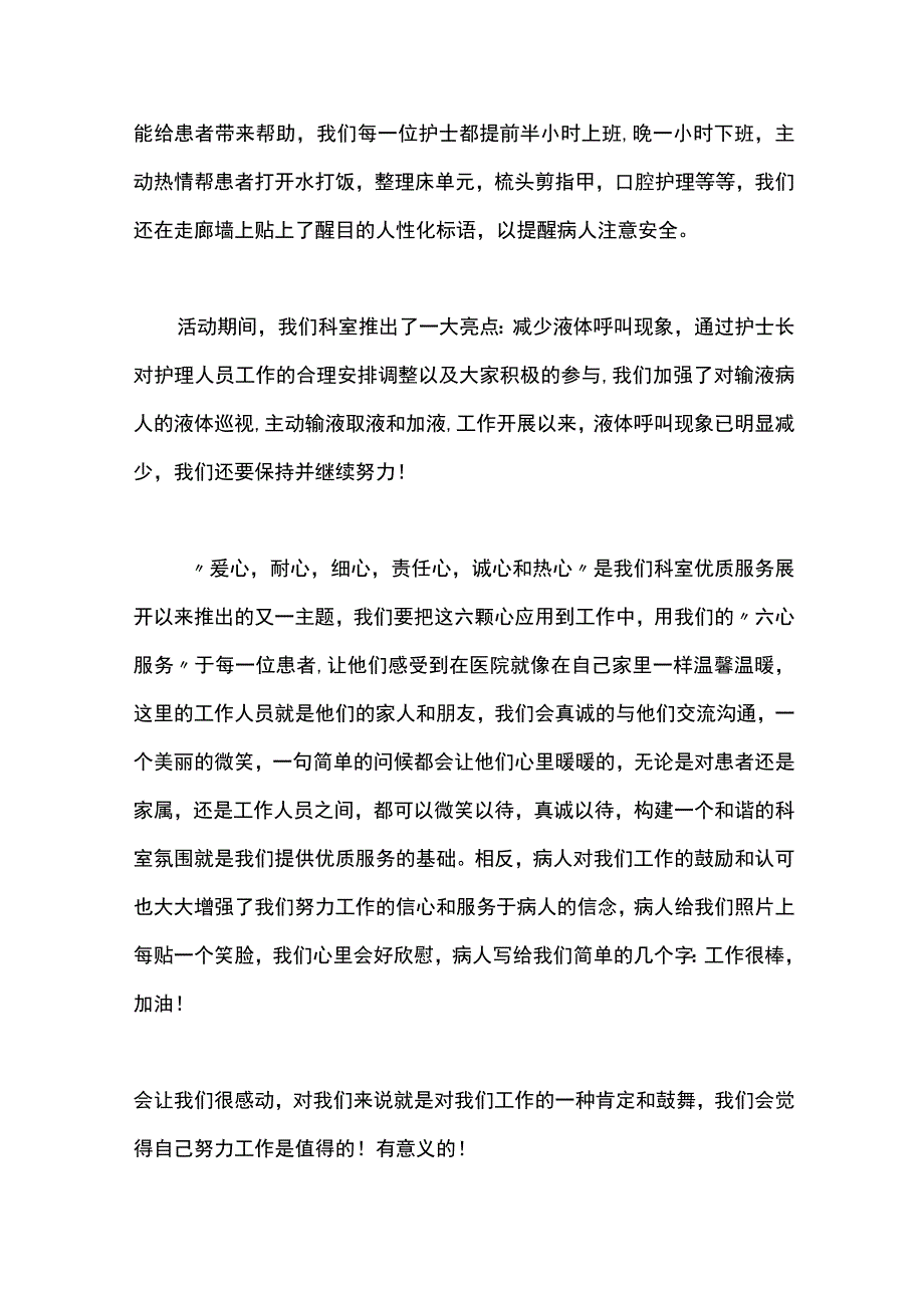 2、,能够成为医院首批优质服务试点病房我们感到非常骄傲和自豪,同时我们也感受到了这种压力对我们工作的推动和鼓舞。全体工作人员都积极参与其中,科主任和护士长组织全科室人员开展了假如我是一个病人的演讲活动,通过此次活动,我最大的感受是一定要把病人当做自己亲人或朋友来对待,用我们的真心真诚的对待他们,这也是我们提供优质服务的前提,将心比心,真诚以待,才能构建和谐的医患关系!我们科室在工作中不断探索和实践,以优质服务为目标,加强基础护理和生活护理,从每一件小事做起,从每一个细节着手,真心希望我们的付出能给患者带来帮助,我们每一位护士都提前半小时上班,晚一小时下班,主动热情帮患者打开水打饭,整理床单元,梳头
