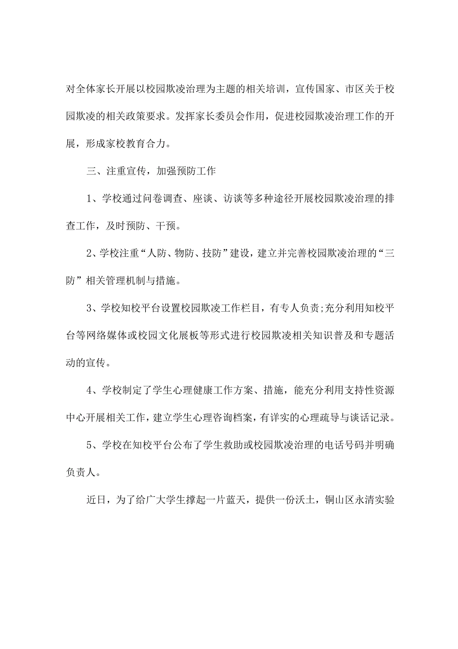 4、关培训,宣传国家、市区关于校园欺凌的相关政策要求。发挥家长委员会作用,促进校园欺凌治理工作的开展,形成家校教育合力。三、注重宣传,加强预防工作1、学校通过问卷调查、座谈、访谈等多种途径开展校园欺凌治理的排查工作,及时预防、干预。2、学校注重“人防、物防、技防”建设,建立并完善校园欺凌治理的“三防”相关管理机制与措施。3、学校知校平台设置校园欺凌工作栏目,有专人负责;充分利用知校平台等网络媒体或校园文化展板等形式进行校园欺凌相关知识普及和专题活动的宣传。4、学校制定了学生心理健康工作方案、措施,能充分利用支持性资源中心开展相关工作,建立学生心理咨询档案,有详实的心理疏导与谈话记录。5、学校在知校