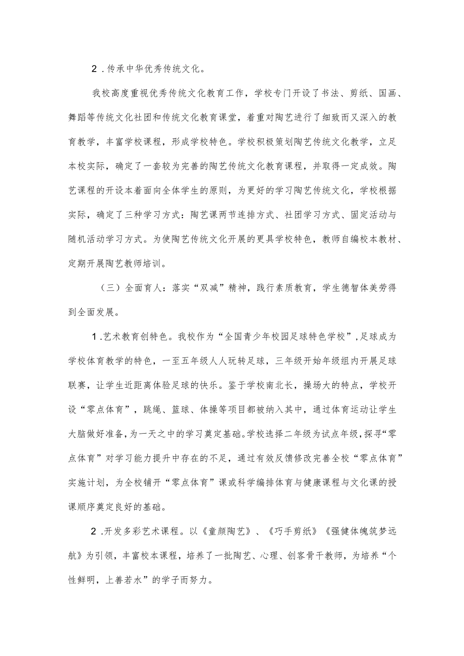 5、优秀传统文化教育工作,学校专门开设了书法、剪纸、国画、舞蹈等传统文化社团和传统文化教育课堂,着重对陶艺进行了细致而又深入的教育教学,丰富学校课程,形成学校特色。学校积极策划陶艺传统文化教学,立足本校实际,确定了一套较为完善的陶艺传统文化教育课程,并取得一定成效。陶艺课程的开设本着面向全体学生的原则,为更好的学习陶艺传统文化,学校根据实际,确定了三种学习方式:陶艺课两节连排方式、社团学习方式、固定活动与随机活动学习方式。为使陶艺传统文化开展的更具学校特色,教师自编校本教材、定期开展陶艺教师培训。(三)全面育人:落实“双减”精神,践行素质教育,学生德智体美劳得到全面发展。1 .艺术教育创特色。我校