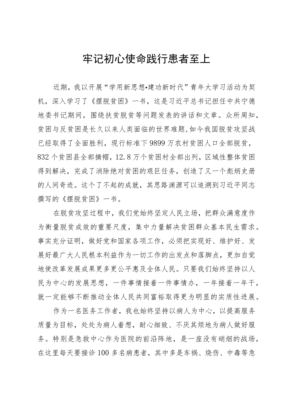 1、牢记初心使命践行患者至上近期,我以开展“学用新思想建功新时代”青年大学习活动为契机,深入学习了摆脱贫困一书,这是习近平总书记担任中共宁德地委书记期间,围绕扶贫脱贫等问题发表的讲话和文章。众所周知,贫困与反贫困是长久以来人类面临的世界难题,如今我国脱贫攻坚战已经取得了全面胜利,现行标准下9899万农村贫困人口全部脱贫,832个贫困县全部摘帽,12.8万个贫困村全部出列,区域性整体贫困得到解决,完成了消除绝对贫困的艰巨任务,创造了又一个彪炳史册的人间奇迹。这个了不起的成就,其思路渊源可以追溯到习近平同志撰写的摆脱贫困一书。在脱贫攻坚过程中,我们党始终坚定人民立场,把群众满意度作为衡量脱贫成效的重要