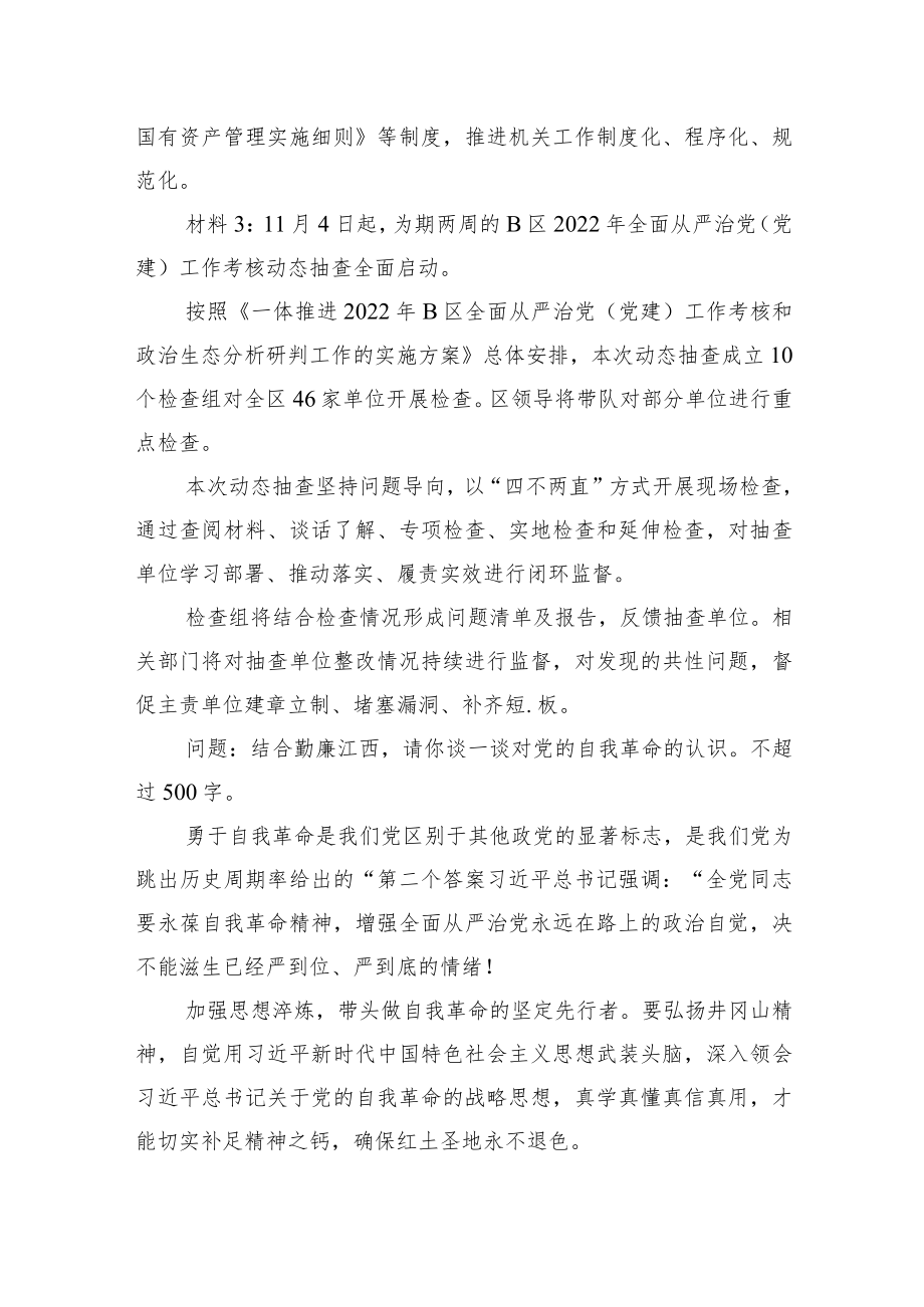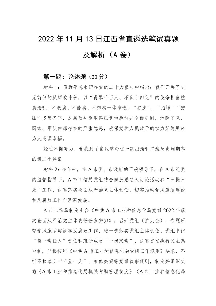 1、2022年11月13日江西省直遴选笔试真题及解析(A卷)第一题:论述题(20分)材料1:习近平总书记在党的二十大报告中指出:我们开展了史无前例的反腐败斗争,以“得罪千百人、不负十四亿”的使命担当祛病治乱,不敢腐、不能腐、不想腐一体推进,“打虎”、“拍蝇”“猎狐”多管齐下,反腐败斗争取得压倒性胜利并全面巩固,消除了党、国家、军队内部存在的严重隐患,确保党和人民赋予的权力始终用来为人民谋幸福。经过不懈努力,党找到了自我革命这一跳出治乱兴衰历史周期率的第二个答案。材料2:今年来,在A市委、市政府的正确领导下,在A市纪委的监督指导下,A市工信局党组结合解放思想大讨论活动和“三提三效”工作,认真落实全面