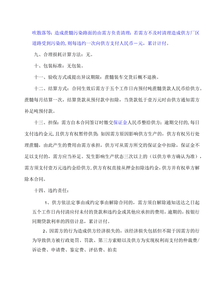 2、,同时收集一联磅单并设立专项统计。六、场地提供及费用:供方提供场地,不收取场地费。需方在供方场地自行投资的设备和厂房,合同终止后由需方自行处理。七、运输方式及到达站(港)的费用负担:汽车运输(需方自行负责);供方厂内交货,运输费用由需方承担。八、需方应确保蔗髓的装运、储存、使用等符合环保规定,对造成的任何环境污染事故,均由需方自行负责,因此导致供方遭受损失的,供方有权向需方追偿。需方运输车辆要做好密封防散落等措施,蔗髓装车完毕后,要盖上篷布防风吹散落等;造成蔗髓污染路面的由需方负责清理;若需方不及时清理造成供方厂区道路受到污染的,则每违约一次向供方支付人民币元,累计计付。九、合理损耗计算方法: