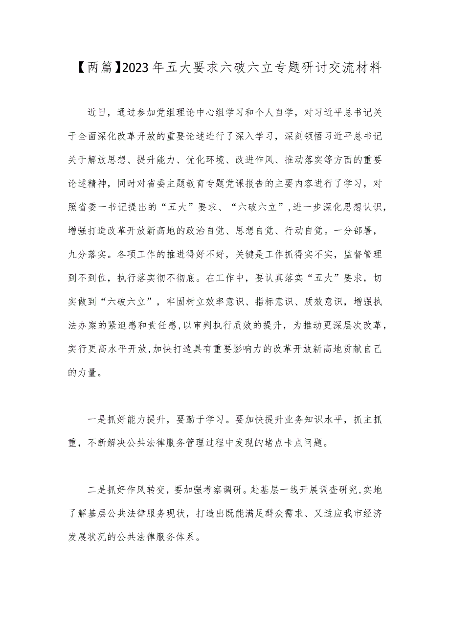 【两篇】2023年五大要求六破六立专题研讨交流材料.docx