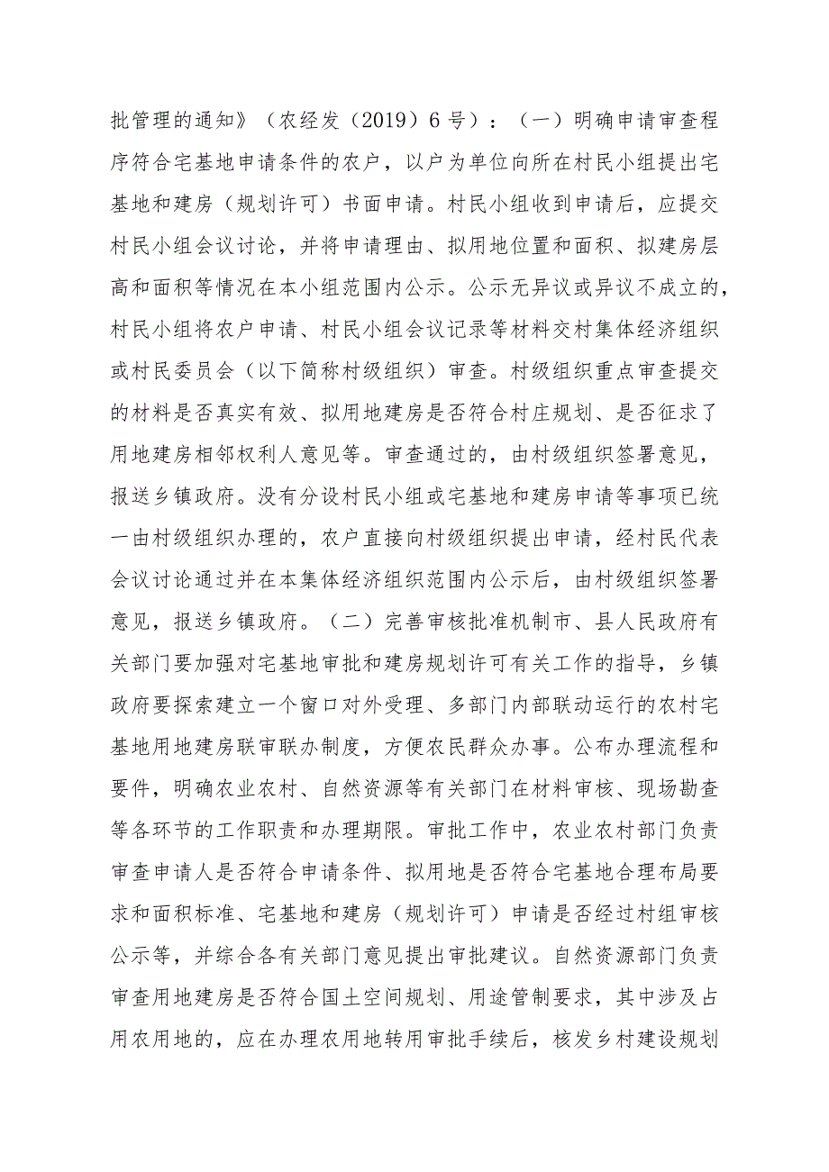 3、)审查。村级组织重点审查提交的材料是否真实有效、拟用地建房是否符合村庄规划、是否征求了用地建房相邻权利人意见等。审查通过的,由村级组织签署意见,报送乡镇政府。没有分设村民小组或宅基地和建房申请等事项已统一由村级组织办理的,农户直接向村级组织提出申请,经村民代表会议讨论通过并在本集体经济组织范围内公示后,由村级组织签署意见,报送乡镇政府。(二)完善审核批准机制市、县人民政府有关部门要加强对宅基地审批和建房规划许可有关工作的指导,乡镇政府要探索建立一个窗口对外受理、多部门内部联动运行的农村宅基地用地建房联审联办制度,方便农民群众办事。公布办理流程和要件,明确农业农村、自然资源等有关部门在材料审核、