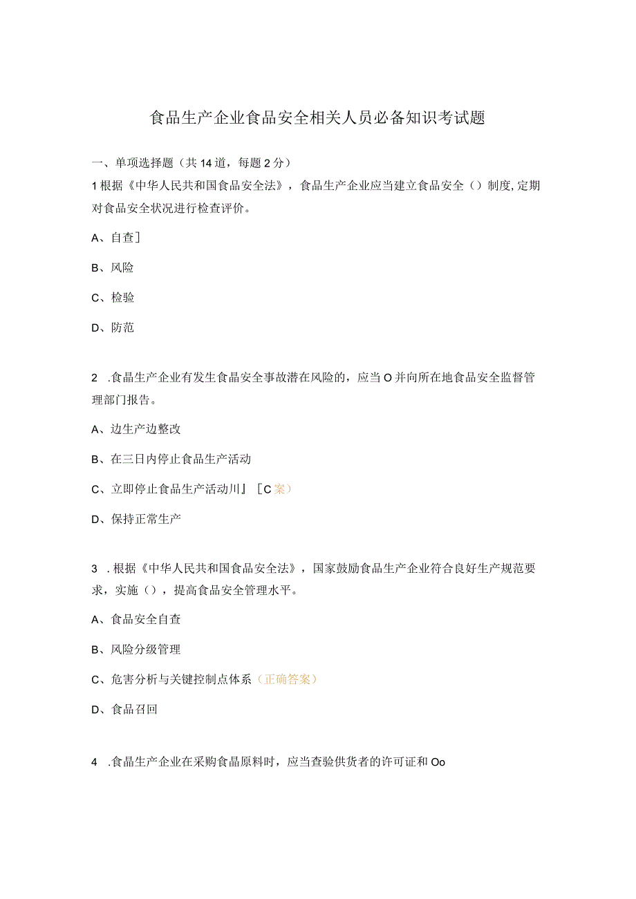1、食品生产企业食品安全相关人员必备知识考试题一、单项选择题(共14道,每题2分)1根据中华人民共和国食品安全法,食品生产企业应当建立食品安全()制度,定期对食品安全状况进行检查评价。A、自查B、风险C、检验D、防范2 .食晶生产企业有发生食晶安全事故潜在风险的,应当O并向所在地食品安全监督管理部门报告。A、边生产边整改B、在三日内停止食品生产活动C、立即停止食品生产活动川C案)D、保持正常生产3 .根据中华人民共和国食品安全法,国家鼓励食品生产企业符合良好生产规范要求,实施(),提高食品安全管理水平。A、食品安全自查B、风险分级管理C、危害分析与关键控制点体系(正确答案)D、食品召回4 .食晶生