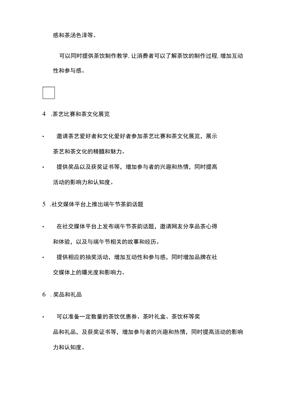 2、版茶饮和茶点推出端午节特色茶饮和茶点,如龙舟粽叶茶、五色粽子茶等,让消费者在品尝茶饮的同时,了解端午节的文化和传统。2 .举行茶文化讲座 邀请茶叶专家进行讲座,介绍茶叶的分类、特点、制作工艺以及与端午节相关的茶文化知识。 提供茶叶品鉴体验,让参与者可以品尝各种不同的茶叶,了解其香气、口感和茶汤色泽等。 在讲座结束后,可以提供茶叶购买服务,让消费者在品尝过茶叶后直接购买,提高销售量。3 .茶艺表演和品鉴活动 邀请具有一定茶艺水平的茶艺师进行现场制作茶饮,展示茶艺之美和茶叶品质之高,增加消费者对茶饮的兴趣和体验。 提供茶饮品尝,让客户可以品尝各种不同口味的茶饮,了解其口感和茶汤色泽等。可以同时提供