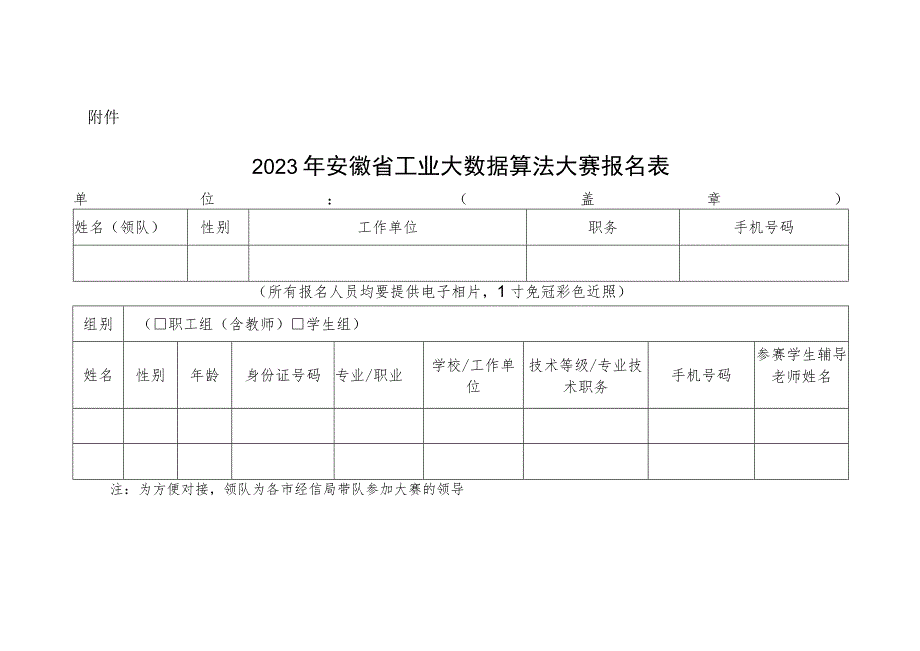 附件2023年安徽省工业大数据算法大赛报名表单位:(盖章)姓名(领队)性别工作单位职务手机号码(所有报名人员均要提供电子相片,1寸免冠彩色近照)组别(职工组(含教师)学生组)姓名性别年龄身份证号码专业/职业学校/工作单位技术等级/专业技术职务手机号码参赛学生辅导老师姓名注:为方便对接,领队为各市经信局带队参加大赛的领导