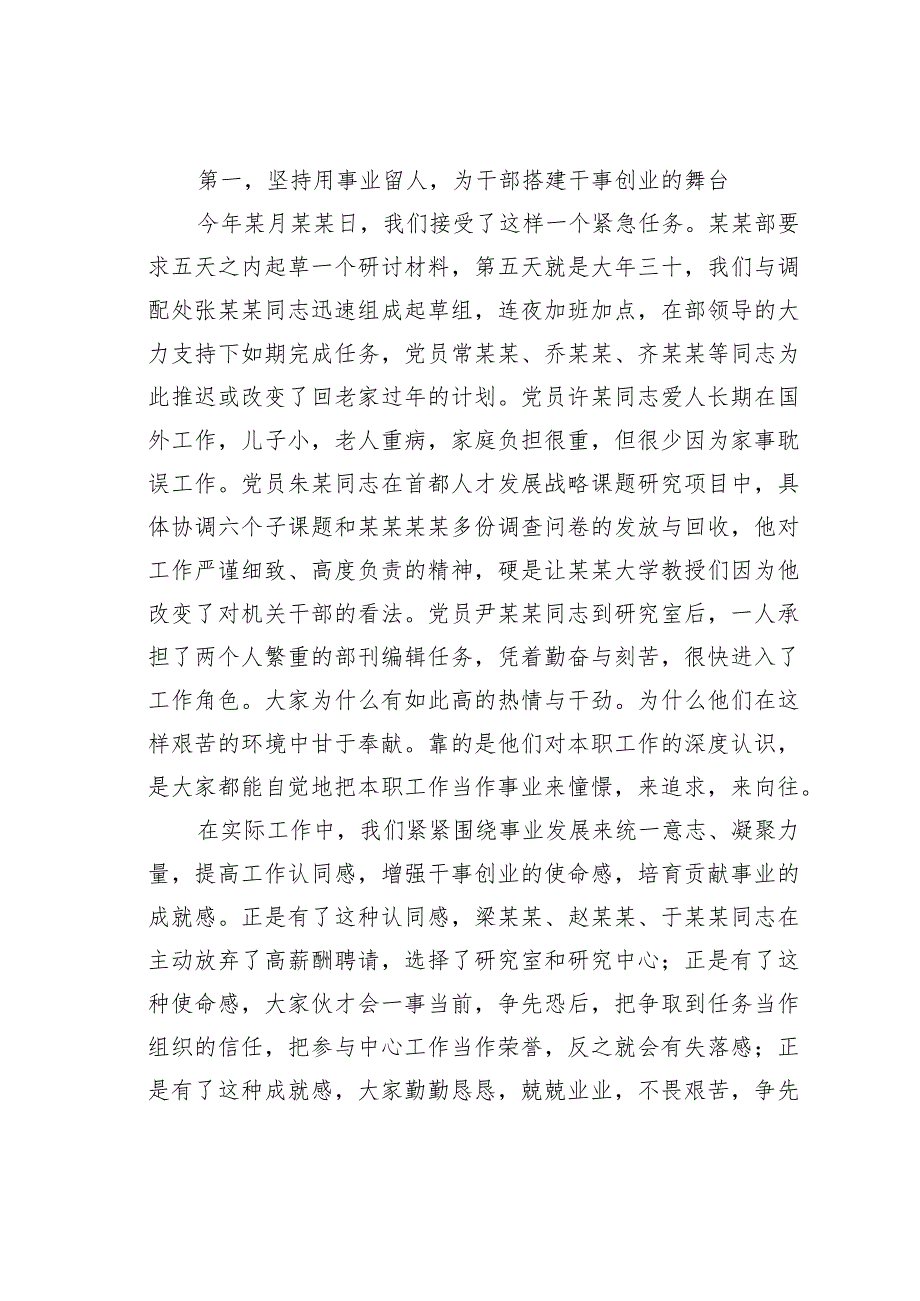 2、支部的同志都清楚:艰苦的工作很重要,艰苦的工作得有人做。同时,大家也体会到“艰苦的工作很难做,但难做的工作锻炼人”。基于这样的认识,我们按照部里“团队式建设、人才式管理、专业化发展”的要求,紧紧围绕承担的职责任务为干部成长搭建舞台,创造条件,营造氛围,整个支部呈现出人心齐、干劲足、成果多的良好局面。我们在工作中主要是做到了“三个坚持”:第一,坚持用事业留人,为干部搭建干事创业的舞台今年某月某某日,我们接受了这样一个紧急任务。某某部要求五天之内起草一个研讨材料,第五天就是大年三十,我们与调配处张某某同志迅速组成起草组,连夜加班加点,在部领导的大力支持下如期完成任务,党员常某某、乔某某、齐某某等同