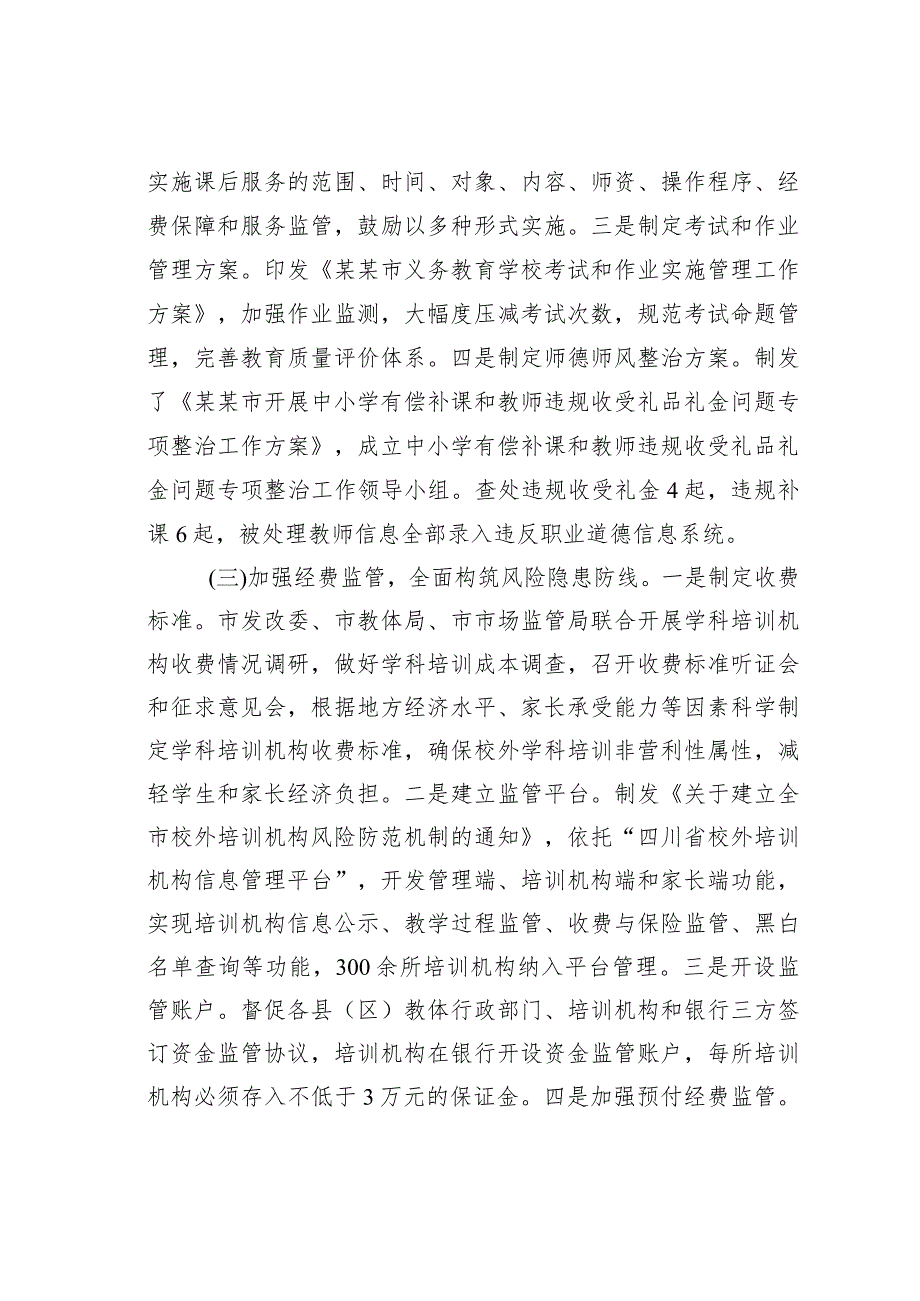 5、,加强作业监测,大幅度压减考试次数,规范考试命题管理,完善教育质量评价体系。四是制定师德师风整治方案。制发了某某市开展中小学有偿补课和教师违规收受礼品礼金问题专项整治工作方案,成立中小学有偿补课和教师违规收受礼品礼金问题专项整治工作领导小组。查处违规收受礼金4起,违规补课6起,被处理教师信息全部录入违反职业道德信息系统。(三)加强经费监管,全面构筑风险隐患防线。一是制定收费标准。市发改委、市教体局、市市场监管局联合开展学科培训机构收费情况调研,做好学科培训成本调查,召开收费标准听证会和征求意见会,根据地方经济水平、家长承受能力等因素科学制定学科培训机构收费标准,确保校外学科培训非营利性属性,减