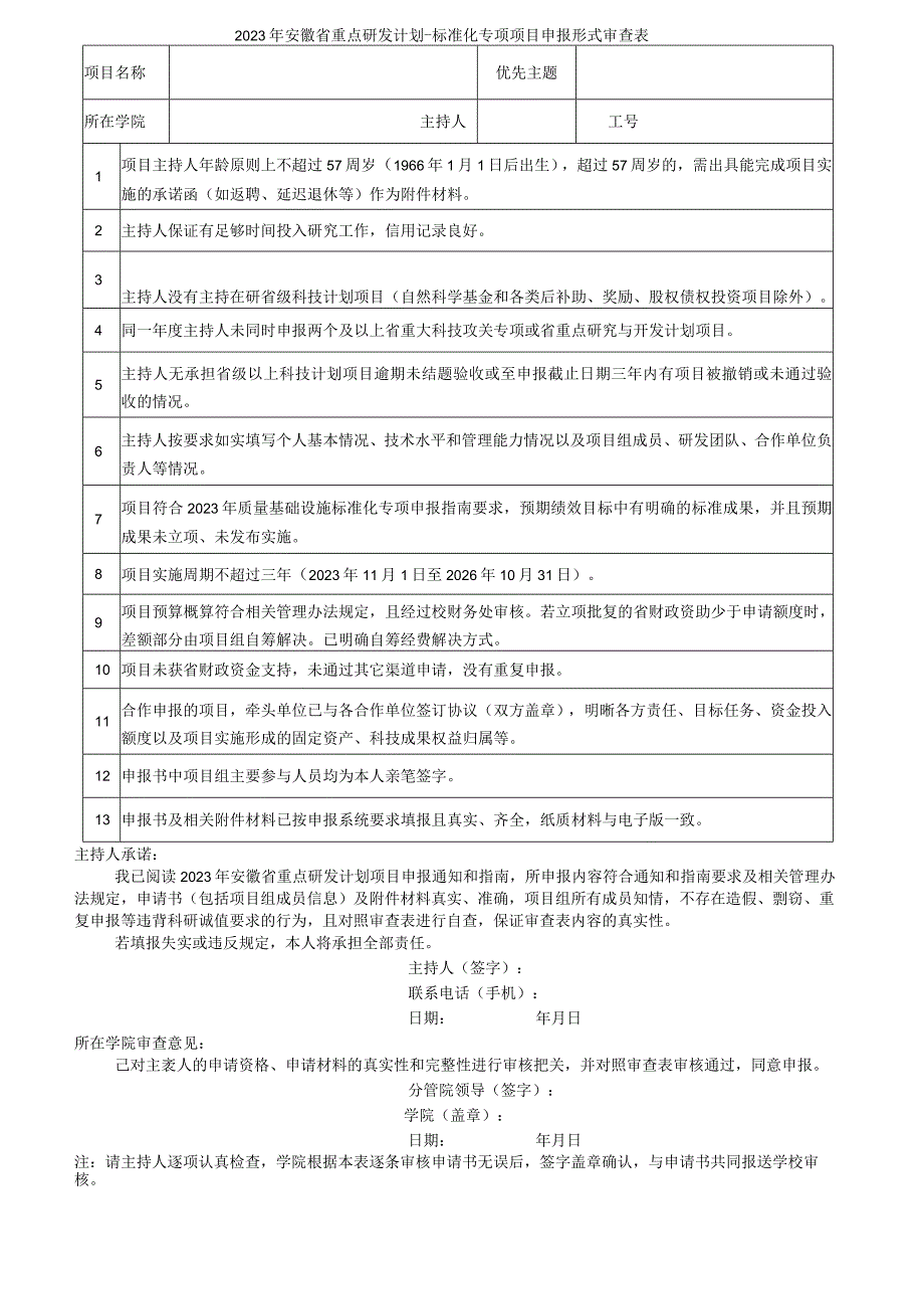 1、2023年安徽省重点研发计划-标准化专项项目申报形式审查表项目名称优先主题所在学院主持人工号1项目主持人年龄原则上不超过57周岁(1966年1月1日后出生),超过57周岁的,需出具能完成项目实施的承诺函(如返聘、延迟退休等)作为附件材料。2主持人保证有足够时间投入研究工作,信用记录良好。3主持人没有主持在研省级科技计划项目(自然科学基金和各类后补助、奖励、股权债权投资项目除外)。4同一年度主持人未同时申报两个及以上省重大科技攻关专项或省重点研究与开发计划项目。5主持人无承担省级以上科技计划项目逾期未结题验收或至申报截止日期三年内有项目被撤销或未通过验收的情况。6主持人按要求如实填写个人基本情况