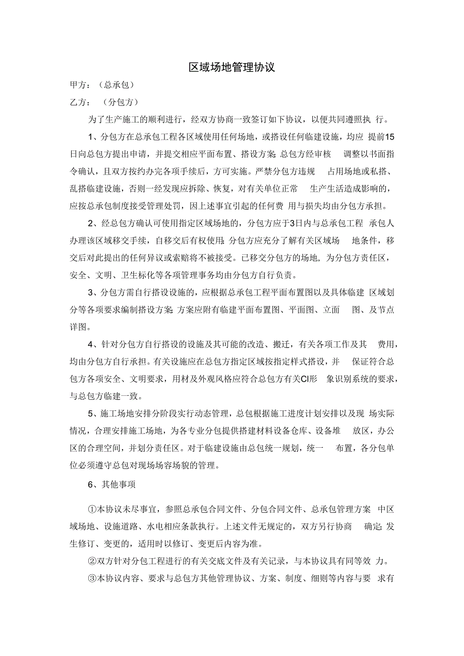 1、区域场地管理协议甲方:(总承包)乙方: (分包方)为了生产施工的顺利进行,经双方协商一致签订如下协议,以便共同遵照执 行。1、分包方在总承包工程各区域使用任何场地,或搭设任何临建设施,均应 提前15日向总包方提出申请,并提交相应平面布置、搭设方案;总包方经审核 调整以书面指令确认,且双方按约办完各项手续后,方可实施。严禁分包方违规 占用场地或私搭、乱搭临建设施,否则一经发现应拆除、恢复,对有关单位正常 生产生活造成影响的,应按总承包制度接受管理处罚,因上述事宜引起的任何费 用与损失均由分包方承担。2、经总包方确认可使用指定区域场地的,分包方应于3日内与总承包工程 承包人办理该区域移交手续,自移