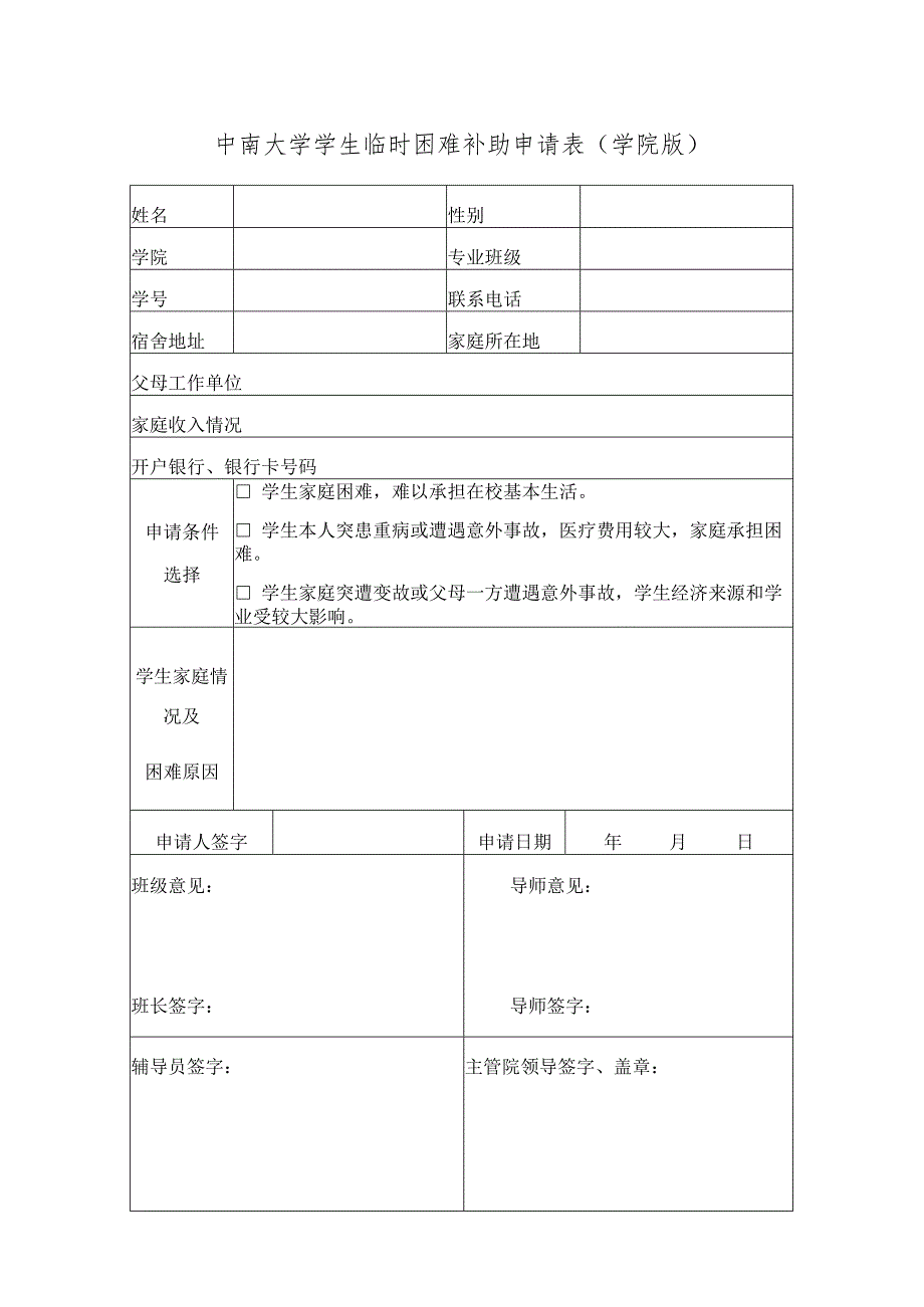- 中南 大学 学生 临时 困难 补助 申请表 学院