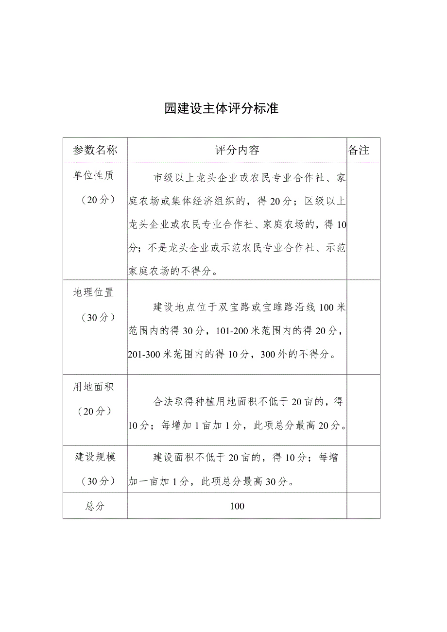 2、项总分最高30分。总分100园建设主体评分标准参数名称评分内容备注单位性质(20分)市级以上龙头企业或农民专业合作社、家庭农场或集体经济组织的,得20分;区级以上龙头企业或农民专业合作社、家庭农场的,得10分;不是龙头企业或示范农民专业合作社、示范家庭农场的不得分。地理位置(30分)建设地点位于双宝路或宝雎路沿线100米范围内的得30分,101-200米范围内的得20分,201-300米范围内的得10分,300外的不得分。用地面积(20分)合法取得种植用地面积不低于20亩的,得10分;每增加1亩加1分,此项总分最高20分。建设规模(30分)建设面积不低于20亩的,得10分;每增加一亩加1分,此项总分最高30分。总分100
