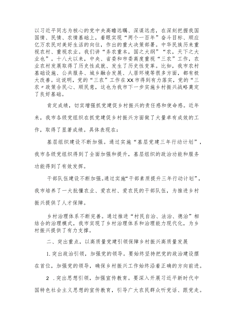 - 某市 组织部长 全市 党建 乡村 振兴 工作会议 讲话