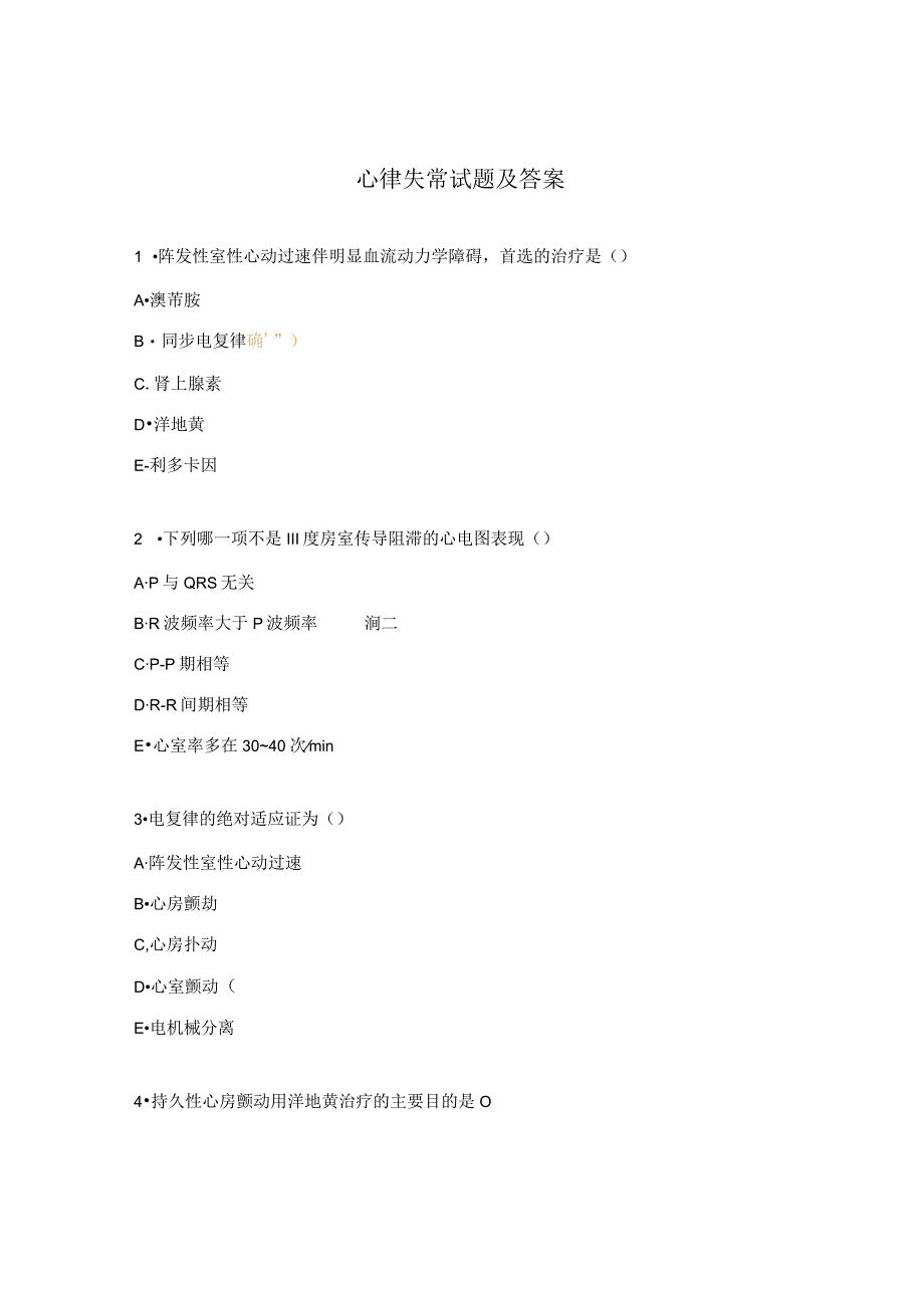 1、心律失常试题及答案1 阵发性室性心动过速伴明显血流动力学障碍,首选的治疗是()A澳芾胺B同步电复律确”)C.肾上腺素D洋地黄E-利多卡因2 下列哪一项不是III度房室传导阻滞的心电图表现()AP与QRS无关BR波频率大于P波频率涧二CP-P期相等DR-R间期相等E心室率多在3040次min3电复律的绝对适应证为()A阵发性室性心动过速B心房颤劫C,心房扑动D心室颤动(E电机械分离4持久性心房颤动用洋地黄治疗的主要目的是OA加强心肌收缩力B减慢心室率,C恢复窦性节律D减慢心房率E预防栓塞5下列哪项为第三度房室传导阻滞的心电图特点?()A心室率小于60次minBQRS波群为室上型CP-P间距小于R