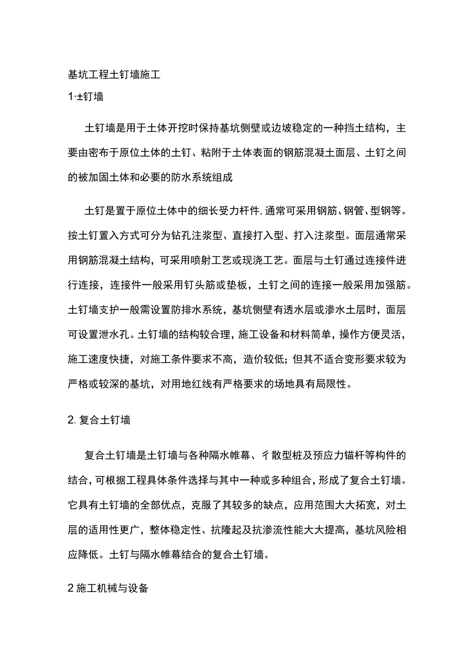 2、工条件要求不高,造价较低;但其不适合变形要求较为严格或较深的基坑,对用地红线有严格要求的场地具有局限性。2.复合土钉墙复合土钉墙是土钉墙与各种隔水帷幕、彳散型桩及预应力锚杆等构件的结合,可根据工程具体条件选择与其中一种或多种组合,形成了复合土钉墙。它具有土钉墙的全部优点,克服了其较多的缺点,应用范围大大拓宽,对土层的适用性更广,整体稳定性、抗隆起及抗渗流性能大大提高,基坑风险相应降低。土钉与隔水帷幕结合的复合土钉墙。2施工机械与设备土钉墙施工主要机械设备包括钻孔机具、注浆泵、混凝土喷射机、空气压缩机,其中空气压缩机是提供钻孔机械和注浆泵的动力设备。钻孑Un具包括锚杆钻机、地质钻机和洛阳铲。3施
