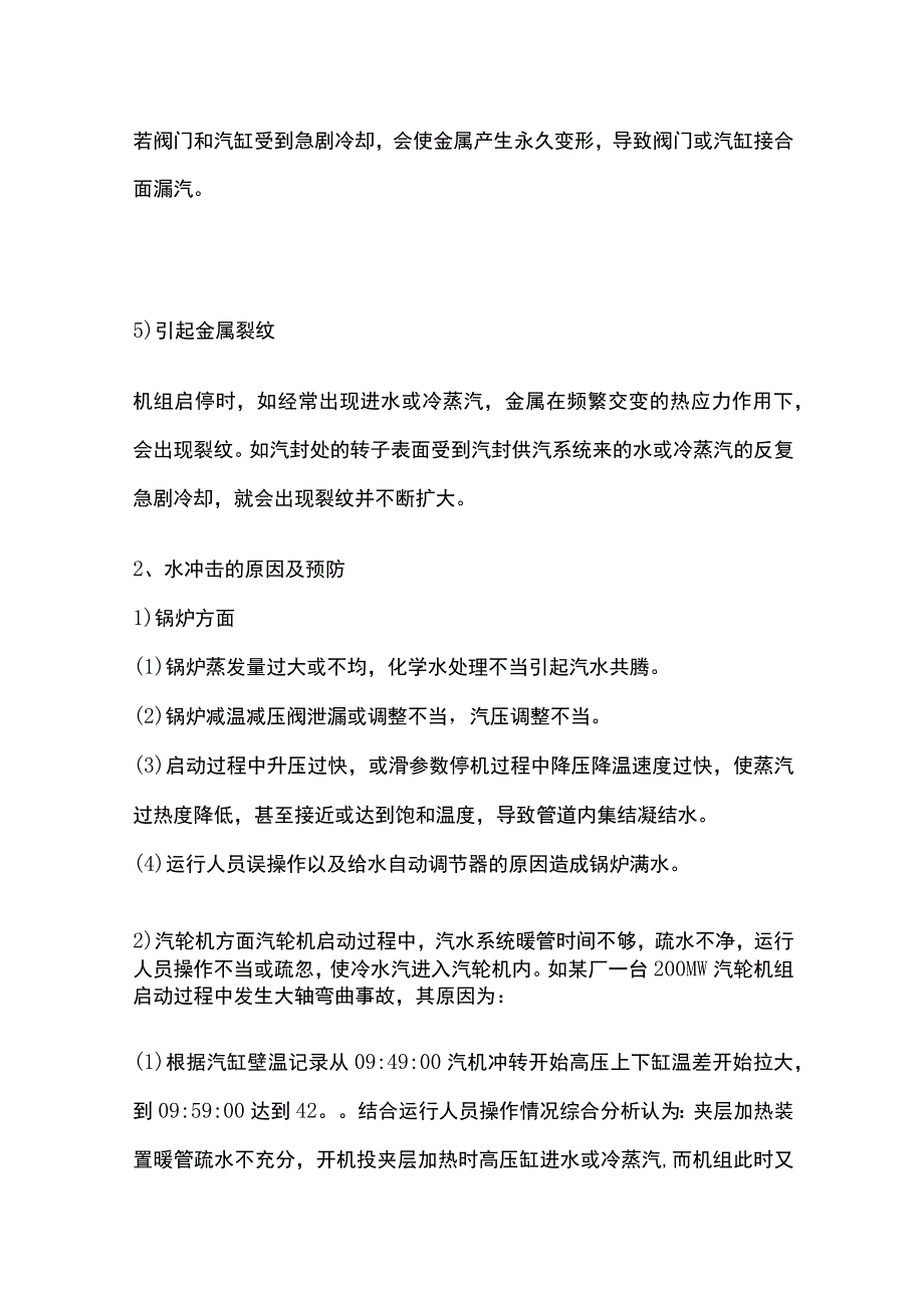 2、一个轴向力,使汽轮机轴向推力增大。实际运行中,轴向推力甚至可增大到正常情况时的10倍,使推力轴承超载而导致乌金烧毁。4)阀门或汽缸接合面漏汽若阀门和汽缸受到急剧冷却,会使金属产生永久变形,导致阀门或汽缸接合面漏汽。5)引起金属裂纹机组启停时,如经常出现进水或冷蒸汽,金属在频繁交变的热应力作用下,会出现裂纹。如汽封处的转子表面受到汽封供汽系统来的水或冷蒸汽的反复急剧冷却,就会出现裂纹并不断扩大。2、水冲击的原因及预防1)锅炉方面(1)锅炉蒸发量过大或不均,化学水处理不当引起汽水共腾。(2)锅炉减温减压阀泄漏或调整不当,汽压调整不当。(3)启动过程中升压过快,或滑参数停机过程中降压降温速度过快,使