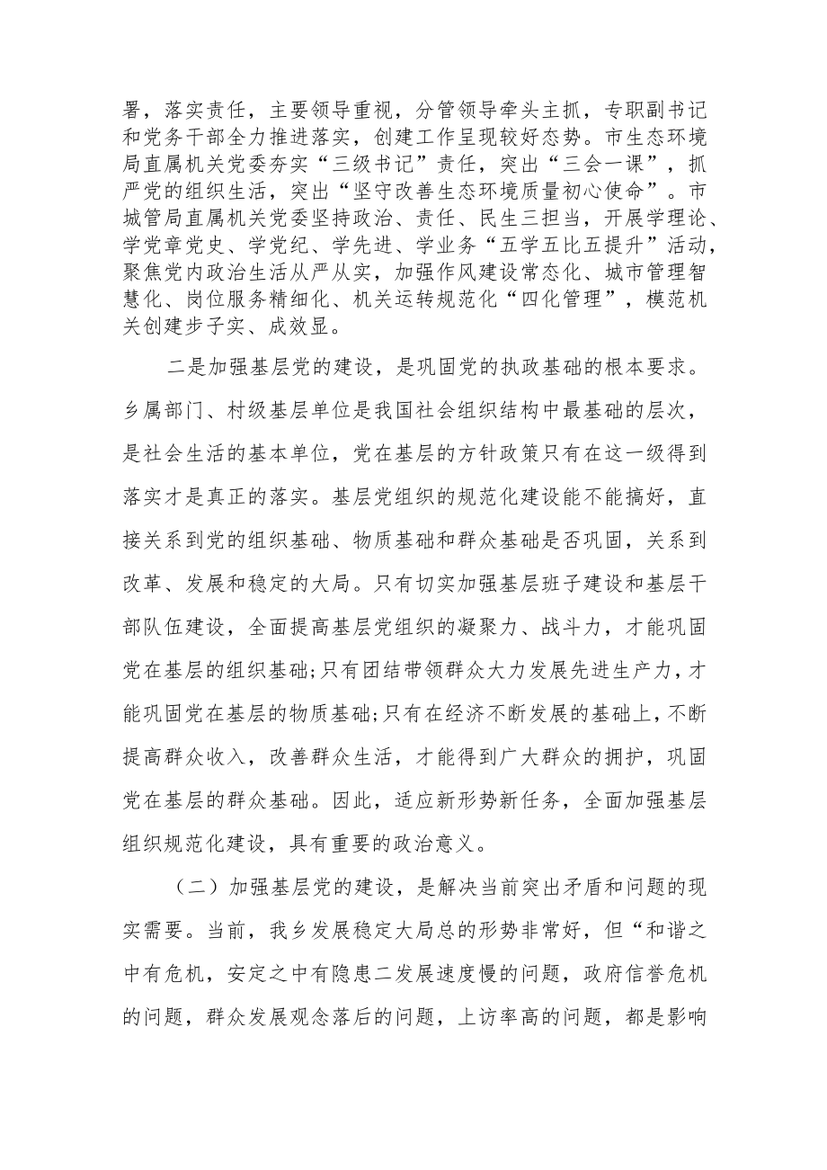 2、头推动,确定了22示范单位,成立了4个指导组,薛部长率先带头抓点示范,落实包抓责任,工委先后多次召开培训会、辅导会、观摩会学习借鉴经验、解答工作难题、提升创建水平,推动了模范机关创建扎实有效开展。主要有以下四个方面特点:一是部门重视、责任落得较实。自去年市直单位创建模范机关工作会以来,各单位创建热情较高,第一时间制定了创建方案,开展了模范机关示范点申报工作,大部分单位还召开了动员部署会议,全面安排推进创建工作。部门党组(党委)研究部署,落实责任,主要领导重视,分管领导牵头主抓,专职副书记和党务干部全力推进落实,创建工作呈现较好态势。市生态环境局直属机关党委夯实“三级书记”责任,突出“三会一课”
