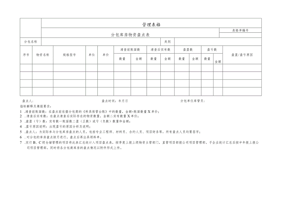 管理表格分包库房物资盘点表表格单编号分包名称类别序号物资名称规格型号单位单价清查前账面数清查后实有数盘盈数盘亏数盘盈/盘亏原因数量金额数量金额数量金额数量金额盘点人:盘点时间:年月日分包单位库管员:指标解释及填报要求:1 .清查前账面数:在盘点前依据分包商的料具保管台账中的数量,金额=账面数量X单价;2 .清查后实有数:在盘点清查后实际存在的物资数量,金额二实有数量X单价;3 .盘盈(亏)数:实有数一账面数二盈(正数)或亏(负数)数量和金额;4 .盈亏原因说明:出现盈亏的原因分析及说明;5 .盘点人:为实际参与分包库房盘点的人员,包括专业工程师、材料员、合约人员、项目财务等,所有盘点人员均要签字;6 .对分包的库房盘点按月进行,盘点后再出具领料单。7 .实行B、C级仓储管理的项目将此表汇总统计入项目盘点表,按季度上报上级物资主管部门,直管项目部报公司项目管理部。子企业统计汇总后按半年报上报公司项目管理部。同时将各分包商库房的盘点情况以附件形式上传。