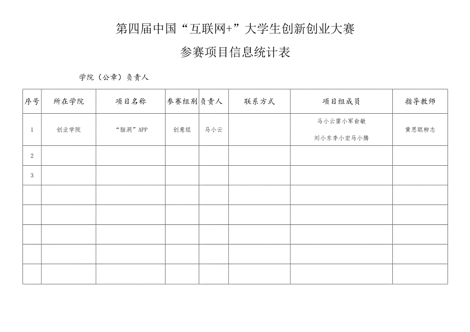 第四届中国“互联网+”大学生创新创业大赛参赛项目信息统计表学院(公章)负责人序号所在学院项目名称参赛组别负责人联系方式项目组成员指导教师1创业学院“脑洞”APP创意组马小云马小云雷小军俞敏刘小东李小宏马小腾黄思聪柳志23注:1.参赛组别分为:创意组、初创组、成长组、就业型创业组,“青年红色筑梦之旅”项目单独报送并注明。2 .项目组成员包含负责人,所有人员排名分先后。3 .请严格参照示例格式填写。