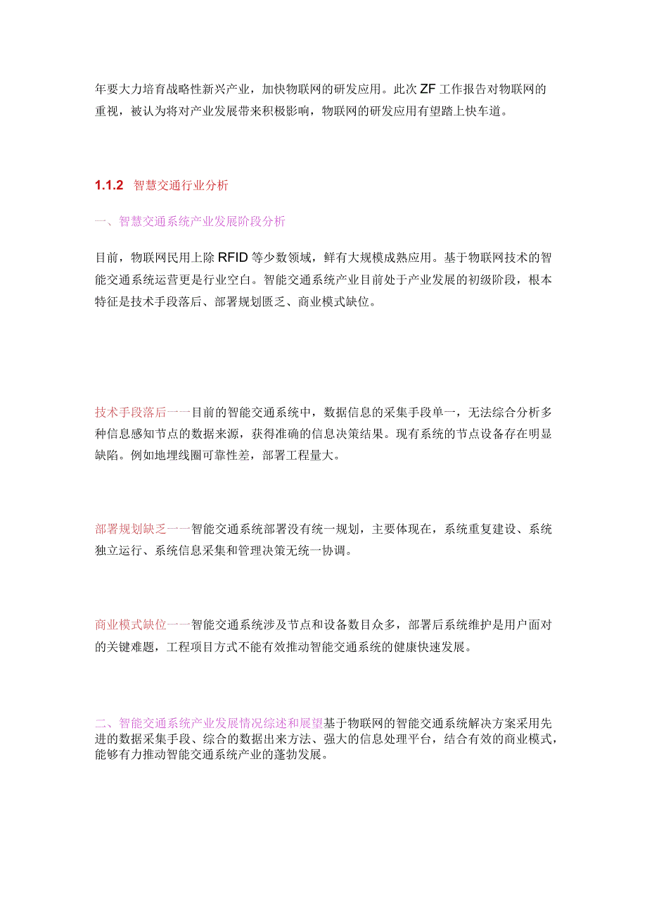 3、极影响,物联网的研发应用有望踏上快车道。1.1.2 智慧交通行业分析一、智慧交通系统产业发展阶段分析目前,物联网民用上除RFID等少数领域,鲜有大规模成熟应用。基于物联网技术的智能交通系统运营更是行业空白。智能交通系统产业目前处于产业发展的初级阶段,根本特征是技术手段落后、部署规划匮乏、商业模式缺位。技术手段落后一一目前的智能交通系统中,数据信息的采集手段单一,无法综合分析多种信息感知节点的数据来源,获得准确的信息决策结果。现有系统的节点设备存在明显缺陷。例如地埋线圈可靠性差,部署工程量大。部署规划缺乏一一智能交通系统部署没有统一规划,主要体现在,系统重复建设、系统独立运行、系统信息采集和管理