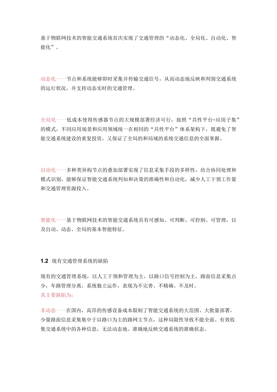 4、决策无统一协调。商业模式缺位一一智能交通系统涉及节点和设备数目众多,部署后系统维护是用户面对的关键难题,工程项目方式不能有效推动智能交通系统的健康快速发展。二、智能交通系统产业发展情况综述和展望基于物联网的智能交通系统解决方案采用先进的数据采集手段、综合的数据出来方法、强大的信息处理平台,结合有效的商业模式,能够有力推动智能交通系统产业的蓬勃发展。基于物联网技术的智能交通系统首次实现了交通管理的“动态化、全局化、自动化、智能化”。动态化一一节点和系统能够即时采集并传输交通信号,从而动态地反映和判别交通系统的运行状况,并支持动态实时的交通管理。全局化一一低成本使得传感器节点的大规模部署经济可行,