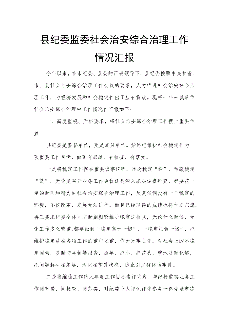 1、县纪委监委社会治安综合治理工作情况汇报今年以来,在市纪委、县委的正确领导下,县纪委按照中央和省、市、县社会治安综合治理工作会议的要求,大力推进社会治安综合治理工作,为经济发展和社会稳定作出了应有贡献。现将一年来我单位社会治安综合治理中工作情况作汇报如下:一、高度重视、严格要求,将社会治安综合治理工作摆上重要位置县纪委是监督单位,更是成员单位。始终把维护社会稳定作为一项重要工作目标,做到有部署、有检查、有落实。一是将稳定工作摆在重要议事议程。常念稳定“经”、常敲稳定“鼓”,无论是召开业务工作会议还是深入基层调查研究,都要花一定的时间和精力讲社会治安综合治理工作,反复强调没有一个稳定的环境,不仅改