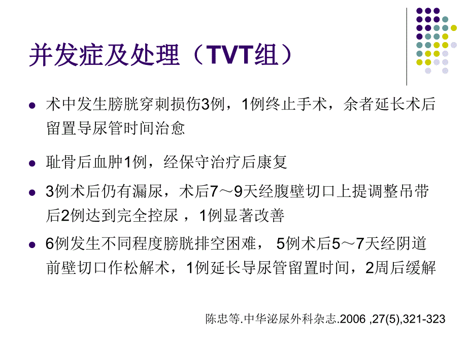 1、TVT及及TVT-O 术后并发症处理术后并发症处理临床资料临床资料l时间:2002年6月2005年5月 l手术分组:TVT组:58例,连硬外麻醉39例,局部麻醉19例 TVT-O组:23例,连硬外麻22例,局部麻醉1例 l疗效:治愈改善无效TVT组52例(89.7)4例(6.9)2例(3.4)TVT-O组22例(95.7)1例(4.3)0例(0)陈忠等.中华泌尿外科杂志.2006,27(5),321-323并发症及处理(并发症及处理(TVT组)组)l术中发生膀胱穿刺损伤3例,1例终止手术,余者延长术后留置导尿管时间治愈l耻骨后血肿1例,经保守治疗后康复 l3例术后仍有漏尿,术后79天经腹壁切口