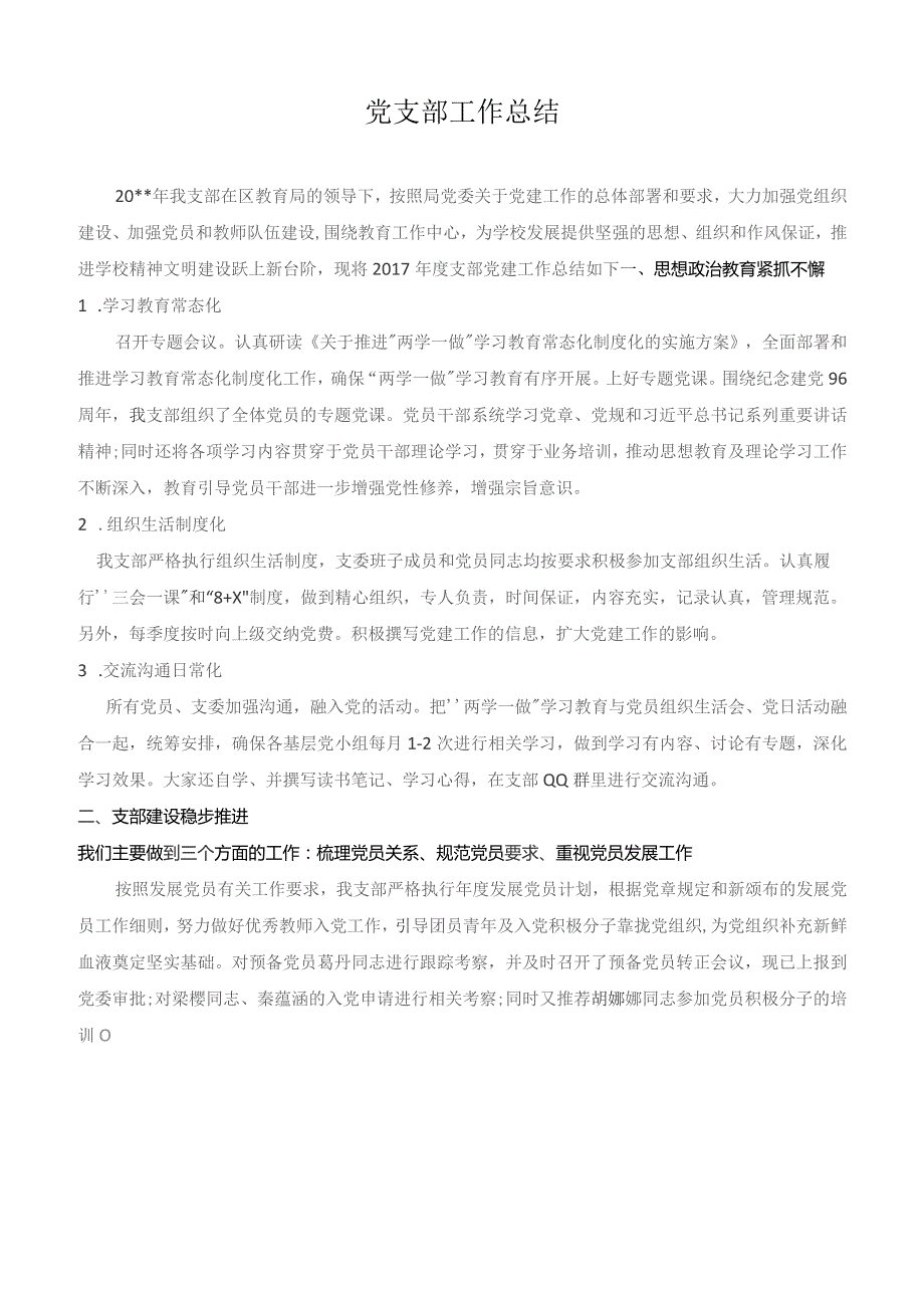 1、党支部工作总结20*年我支部在区教育局的领导下,按照局党委关于党建工作的总体部署和要求,大力加强党组织建设、加强党员和教师队伍建设,围绕教育工作中心,为学校发展提供坚强的思想、组织和作风保证,推进学校精神文明建设跃上新台阶,现将2017年度支部党建工作总结如下一、思想政治教育紧抓不懈1 .学习教育常态化召开专题会议。认真研读关于推进两学一做学习教育常态化制度化的实施方案,全面部署和推进学习教育常态化制度化工作,确保“两学一做学习教育有序开展。上好专题党课。围绕纪念建党96周年,我支部组织了全体党员的专题党课。党员干部系统学习党章、党规和习近平总书记系列重要讲话精神;同时还将各项学习内容贯穿于党