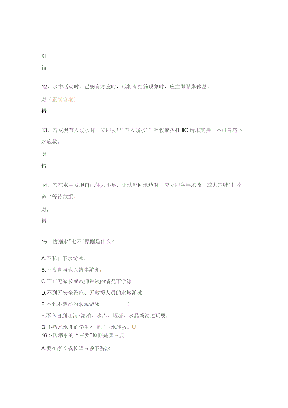 2、可以C、试试看7不明溪流、池塘等地形或水深处O游泳A、可以B、不可以5C、试试看二、判断题8.当发生溺水时,可以将采取头顶向后,口向上方,将口鼻露出水面。对错9.落水后立即屏住呼吸,踢掉双鞋,然后放松肢体等待浮出水面,尽可能地保持仰位,使头部后仰,尽量用嘴吸气、用鼻呼气、以防呛水。对(正确答案)10、夏天太热,吃完中午饭后立即游泳消暑解热。对错11、池边不可奔跑或追逐,以免滑倒受伤。对错12、水中活动时,已感有寒意时,或将有抽筋现象时,应立即登岸休息。对(正确答案)错13、若发现有人溺水时,立即发出有人溺水”呼救或拨打IlO请求支持,不可冒然下水施救。对错14、若在水中发现自己体力不足,无法游