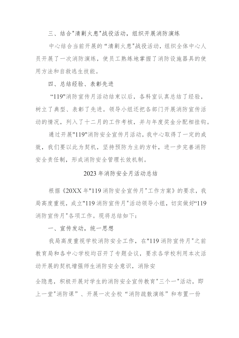3、自救逃生技能。四、总结经验、表彰先进“119消防宣传月活动结束以后,各科室认真总结了经验,树立了典型、表彰了先进。领导小组还把各部门开展消防宣传活动的情况,列入了十二月的工作考核,并与年度奖金分配相挂钩。通过开展119消防安全宣传月活动,我中心取得了一定的成效,我们要以此为契机,坚持预防为主的方针,进一步完善消防安全责任制,形成消防安全管理长效机制。2023年消防安全月活动总结根据20XX年119消防安全宣传月工作方案的要求,我局高度重视,成立119消防宣传月活动领导小组,切实做好“119消防宣传月各项工作。现将总结如下:一、宣传发动,统一思想我局高度重视学校消防安全工作,在119消防宣传月之