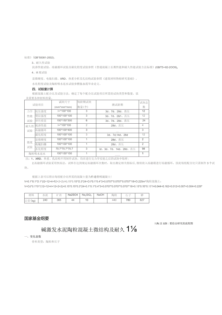4、0081-2002)。3、耐久性试验抗渗性能试验、冻融循环试验及碳化程度试验参照普通混凝上长期性能和耐久性能试验方法标准(GBT582-2OO9)o4、ift观试验显微硬度、电镜扫描、XRD、热重分析及孔结构试验参照建筑材料物相研究基础。水化程度试验及陶粒吸水返水试验参照张永霞毕业论文。四、试殴量计算根据混凝土配合比及试验方法,确定了每个配合比试验项目所需的试块类型和数量,以及需要各种材料的量。试验项目试块尺寸(mm*mm*mm)每龄期试块数量(个)测试龄期试块总数力学性能试验抗压强度l*100*10033d、7d、28d、蒸压12劈拉强度100*100*10033d、7d、2&1、蒸压12弹