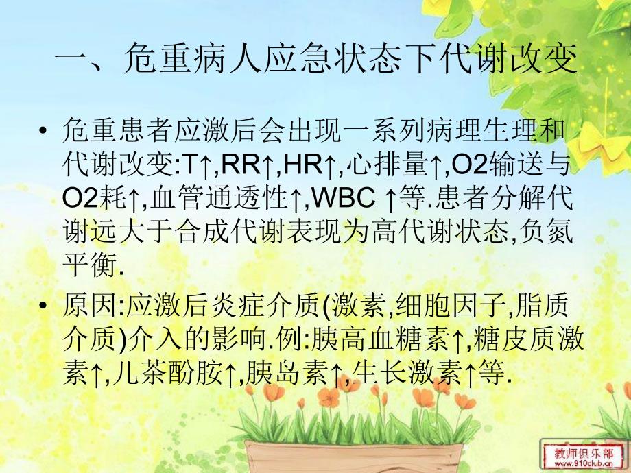 1、危重病人的营养支持危重病人的营养支持 一、危重病人应急状态下代谢的改变 二、危重病人营养支持的方式及并发症 三、危重病人营养支持总结一、危重病人应急状态下代谢改变 危重患者应激后会出现一系列病理生理和代谢改变:T,RR,HR,心排量,O2输送与O2耗,血管通透性,WBC 等.患者分解代谢远大于合成代谢表现为高代谢状态,负氮平衡.原因:应激后炎症介质(激素,细胞因子,脂质介质)介入的影响.例:胰高血糖素,糖皮质激素,儿茶酚胺,胰岛素,生长激素等.1.危重病人能量代谢的改变 能量消耗增加.蛋白质分解增加,净氮丢失增加,出现负氮平衡,内脏蛋白与肌肉蛋白合成下降.葡萄糖需要量增加,但氧化利用障碍,血糖