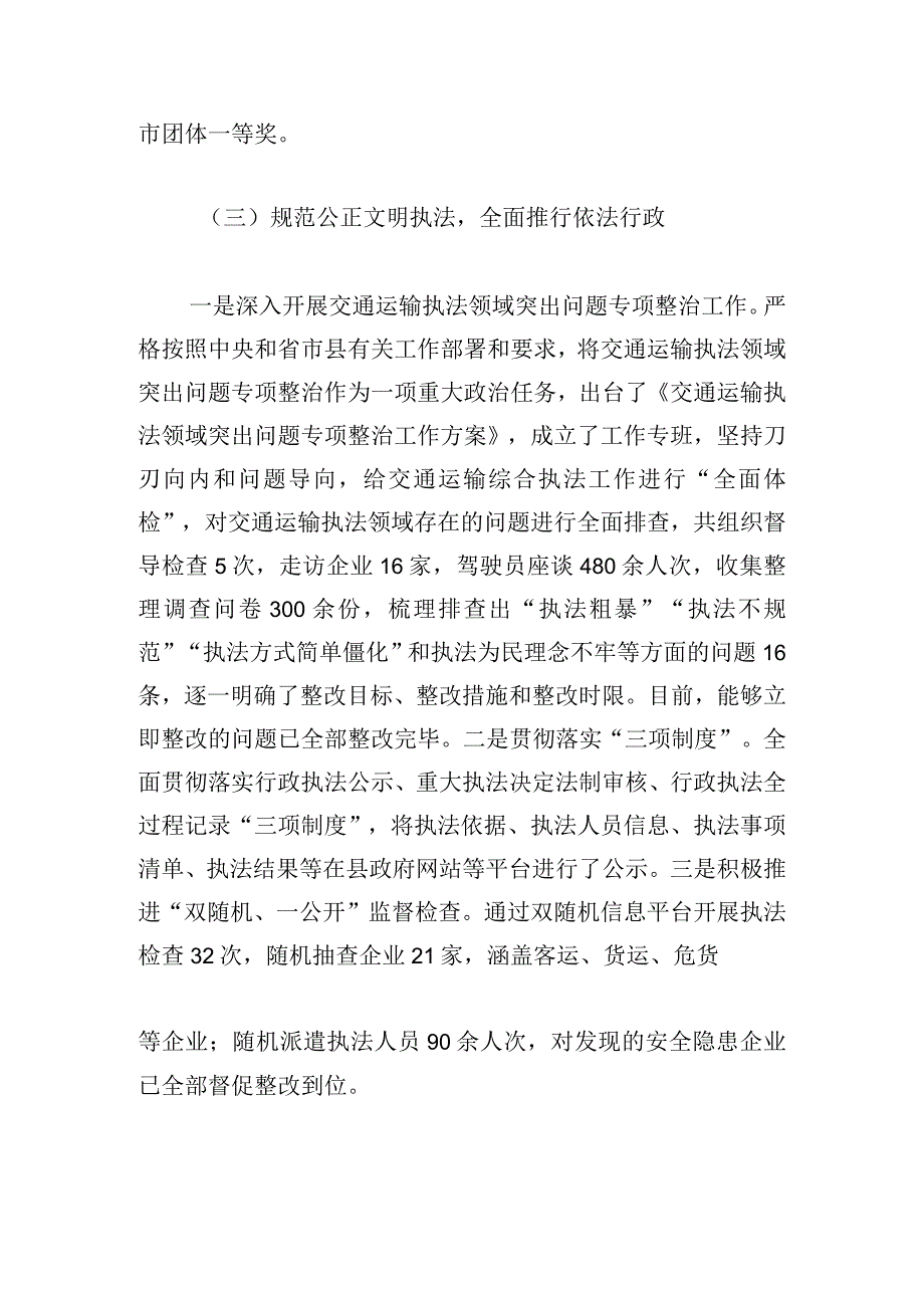 4、等方式,进一步强化业务知识学习,深化交通运输各项法律法规的实践应用,不断提升执法办案能力、水平和质量。今年来,共培训执法人员300余人次。在全市交通运输综合执法大比武活动中,我局荣获个人二等奖4人次,三等奖1人次,一举夺得全市团体一等奖。(三)规范公正文明执法,全面推行依法行政一是深入开展交通运输执法领域突出问题专项整治工作。严格按照中央和省市县有关工作部署和要求,将交通运输执法领域突出问题专项整治作为一项重大政治任务,出台了交通运输执法领域突出问题专项整治工作方案,成立了工作专班,坚持刀刃向内和问题导向,给交通运输综合执法工作进行“全面体检”,对交通运输执法领域存在的问题进行全面排查,共组织