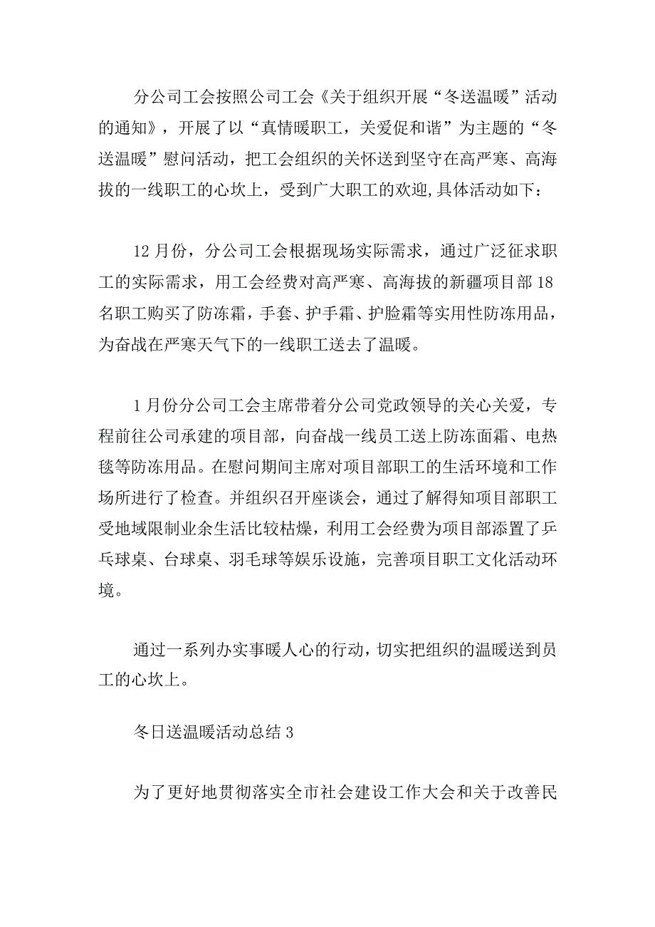 3、司党政领导的关心关爱,专程前往公司承建的项目部,向奋战一线员工送上防冻面霜、电热毯等防冻用品。在慰问期间主席对项目部职工的生活环境和工作场所进行了检查。并组织召开座谈会,通过了解得知项目部职工受地域限制业余生活比较枯燥,利用工会经费为项目部添置了乒乓球桌、台球桌、羽毛球等娱乐设施,完善项目职工文化活动环境。通过一系列办实事暖人心的行动,切实把组织的温暖送到员工的心坎上。冬日送温暖活动总结3为了更好地贯彻落实全市社会建设工作大会和关于改善民生、维护稳定的要求,在传统节日中体现党和政府关爱,在走访慰问中了解青少年基本需求,努力做到困难青少年得实惠、团员团干受教育、各界青年创和谐,根据团市委关于开展