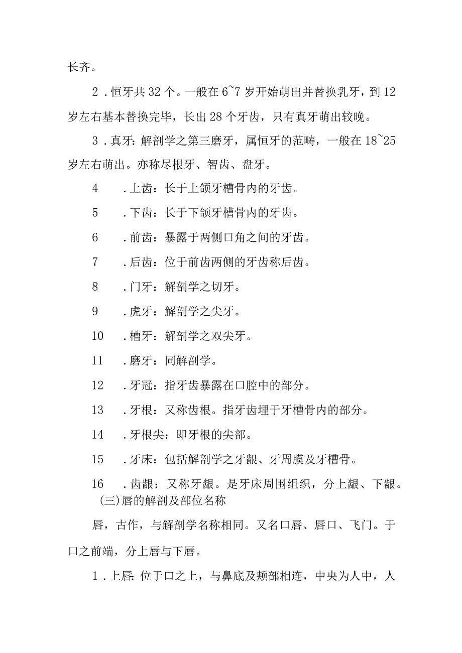 4、剖学之第三磨牙,属恒牙的范畴,一般在1825岁左右萌出。亦称尽根牙、智齿、盘牙。4 .上齿:长于上颌牙槽骨内的牙齿。5 .下齿:长于下颌牙槽骨内的牙齿。6 .前齿:暴露于两侧口角之间的牙齿。7 .后齿:位于前齿两侧的牙齿称后齿。8 .门牙:解剖学之切牙。9 .虎牙:解剖学之尖牙。10 .槽牙:解剖学之双尖牙。11 .磨牙:同解剖学。12 .牙冠:指牙齿暴露在口腔中的部分。13 .牙根:又称齿根。指牙齿埋于牙槽骨内的部分。14 .牙根尖:即牙根的尖部。15 .牙床:包括解剖学之牙龈、牙周膜及牙槽骨。16 .齿龈:又称牙龈。是牙床周围组织,分上龈、下龈。(三)唇的解剖及部位名称唇,古作,与解剖学名