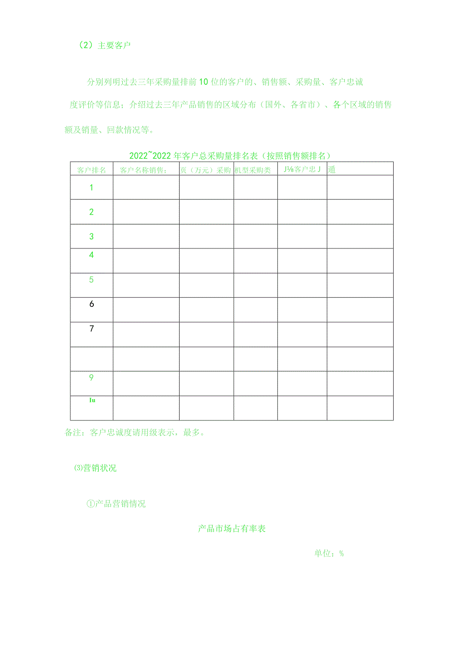 3、品销售的区域分布(国外、各省市)、各个区域的销售额及销量、回款情况等。20222022年客户总采购量排名表(按照销售额排名)客户排名客户名称销售;页(万元)采购机型采购类J客户忠J遁12345679Iu备注:客户忠诚度请用级表示,最多。营销状况产品营销情况产品市场占有率表单位:%2022年022年2022年系列系列二系列三系列四系列五备注:1、仅指国市场的产品占有率。2、计算公式:产品市场占有率=本企业在国销量/(本企业在国销量+国竞争对手在国销售量+国外竞争对手在国销最)售后效劳体系3、产品技术状况(1)产品技术现状当前相关技术水平评价产品技术储藏状况(2)产品核心技术和关键技术(3)产品技