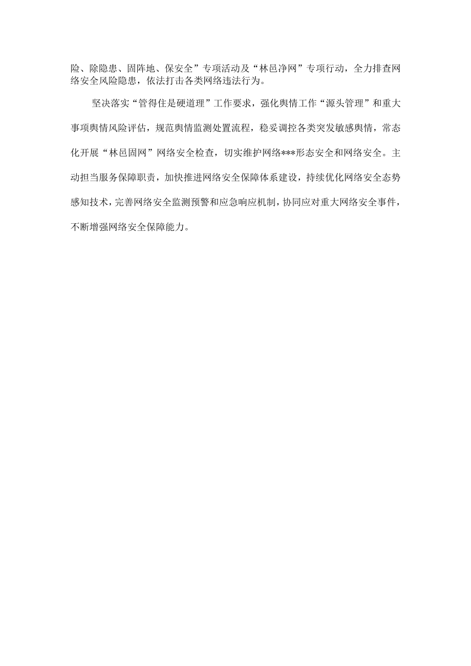 2、、健全保障体系、提升保护能力等方面,为保障网络安全提供了法律依据。我们将切实增强安全发展*,牢固树立正确的网络安全观,坚持把*的领导作为网络安全工作的根本保证,充分发挥各级*委网信委的统筹协调作用,确保网信事业始终沿着正确方向前进。正确处理好安全和发展的关系,遵循“统筹规划、创新引领、开放共享、保障安全”原则,把网络安全和信息化作为一体之两翼、驱动之双轮,统一谋划、统一部署、统一推进、统一实施,以安全保发展、以发展促安全。坚持依法管网治网用网,加快推进网信事业法治化、制度化、规范化发展。全面提升依法治网水*,坚持以贯彻落实条例为强大武器,持续推进网络综合治理体系建设、网络安全应急指挥中心标准化建设、互联网违法和不良信息举报受理处置一体化建设,深入开展网络领域“查风险、除隐患、固阵地、保安全”专项活动及“林邑净网”专项行动,全力排查网络安全风险隐患,依法打击各类网络违法行为。坚决落实“管得住是硬道理”工作要求,强化舆情工作“源头管理”和重大事项舆情风险评估,规范舆情监测处置流程,稳妥调控各类突发敏感舆情,常态化开展“林邑固网”网络安全检查,切实维护网络*形态安全和网络安全。主动担当服务保障职责,加快推进网络安全保障体系建设,持续优化网络安全态势感知技术,完善网络安全监测预警和应急响应机制,协同应对重大网络安全事件,不断增强网络安全保障能力。