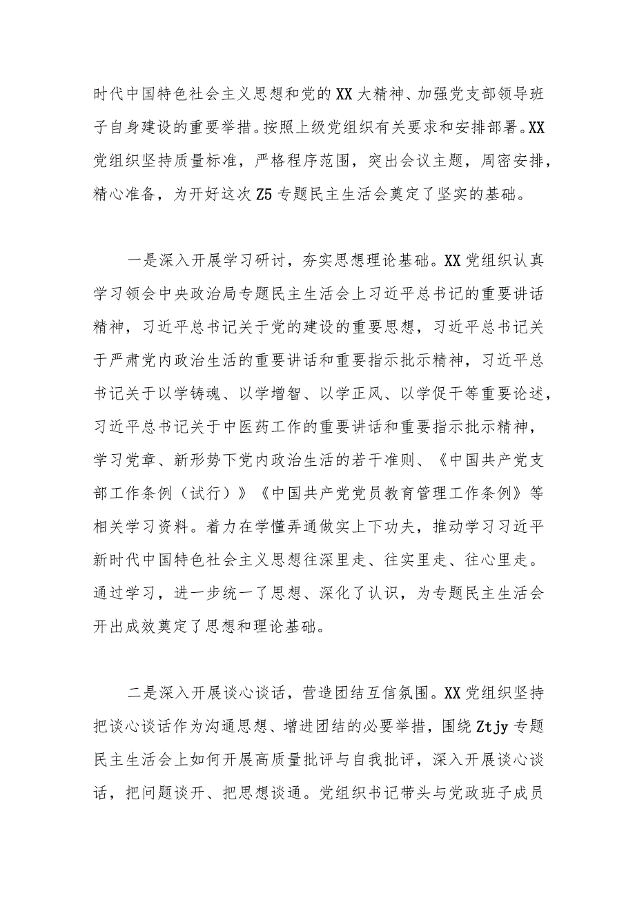 4、坚持质量标准,严格程序范围,突出会议主题,周密安排,精心准备,为开好这次Z5专题民主生活会奠定了坚实的基础。一是深入开展学习研讨,夯实思想理论基础。XX党组织认真学习领会中央政治局专题民主生活会上习近平总书记的重要讲话精神,习近平总书记关于党的建设的重要思想,习近平总书记关于严肃党内政治生活的重要讲话和重要指示批示精神,习近平总书记关于以学铸魂、以学增智、以学正风、以学促干等重要论述,习近平总书记关于中医药工作的重要讲话和重要指示批示精神,学习党章、新形势下党内政治生活的若干准则、中国共产党支部工作条例(试行)中国共产党党员教育管理工作条例等相关学习资料。着力在学懂弄通做实上下功夫,推动学习习