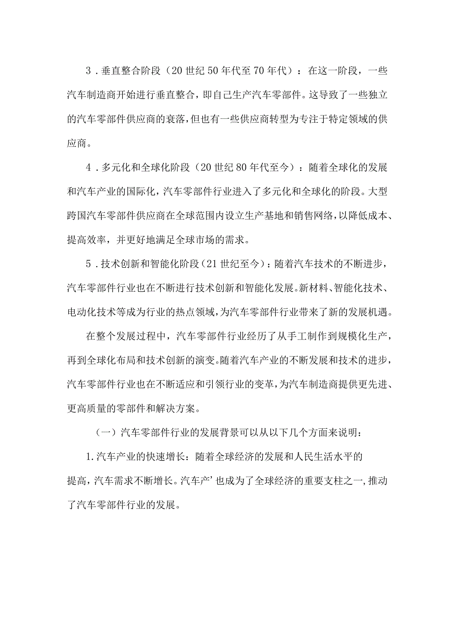 5、.技术创新和智能化阶段(21世纪至今):随着汽车技术的不断进步,汽车零部件行业也在不断进行技术创新和智能化发展。新材料、智能化技术、电动化技术等成为行业的热点领域,为汽车零部件行业带来了新的发展机遇。在整个发展过程中,汽车零部件行业经历了从手工制作到规模化生产,再到全球化布局和技术创新的演变。随着汽车产业的不断发展和技术的进步,汽车零部件行业也在不断适应和引领行业的变革,为汽车制造商提供更先进、更高质量的零部件和解决方案。(一)汽车零部件行业的发展背景可以从以下几个方面来说明:1.汽车产业的快速增长:随着全球经济的发展和人民生活水平的提高,汽车需求不断增长。汽车产也成为了全球经济的重要支柱之一