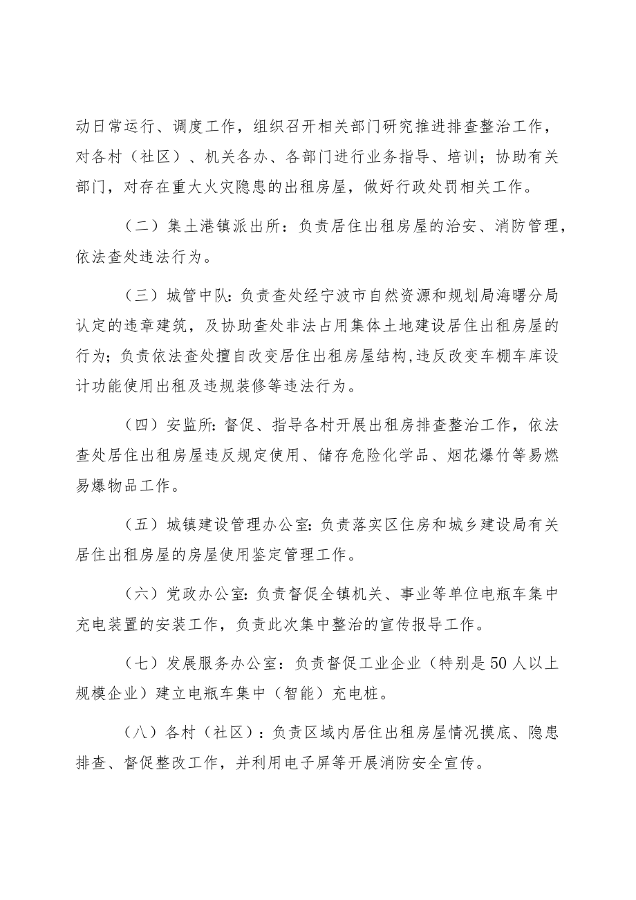 2、行重点整治,确保全镇消防安全形势不断好转。二、职责分工各村(社区)、机关各办、各部门要切实履行职责,协同配合做好此次整治工作。具体如下:(一)镇消防工作站:负责制定整治行动工作方案,负责整治行动日常运行、调度工作,组织召开相关部门研究推进排查整治工作,对各村(社区)、机关各办、各部门进行业务指导、培训;协助有关部门,对存在重大火灾隐患的出租房屋,做好行政处罚相关工作。(二)集土港镇派出所:负责居住出租房屋的治安、消防管理,依法查处违法行为。(三)城管中队:负责查处经宁波市自然资源和规划局海曙分局认定的违章建筑,及协助查处非法占用集体土地建设居住出租房屋的行为;负责依法查处擅自改变居住出租房屋结