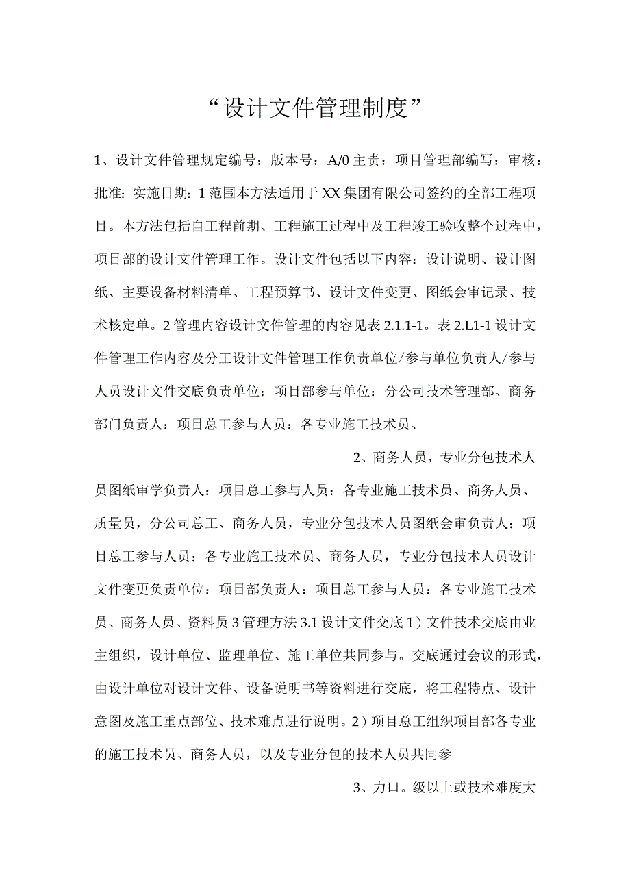 1、“设计文件管理制度”1、设计文件管理规定编号:版本号:A/0主责:项目管理部编写:审核:批准:实施日期:1范围本方法适用于XX集团有限公司签约的全部工程项目。本方法包括自工程前期、工程施工过程中及工程竣工验收整个过程中,项目部的设计文件管理工作。设计文件包括以下内容:设计说明、设计图纸、主要设备材料清单、工程预算书、设计文件变更、图纸会审记录、技术核定单。2管理内容设计文件管理的内容见表2.1.1-1。表2.L1-1设计文件管理工作内容及分工设计文件管理工作负责单位/参与单位负责人/参与人员设计文件交底负责单位:项目部参与单位:分公司技术管理部、商务部门负责人:项目总工参与人员:各专业施工技术