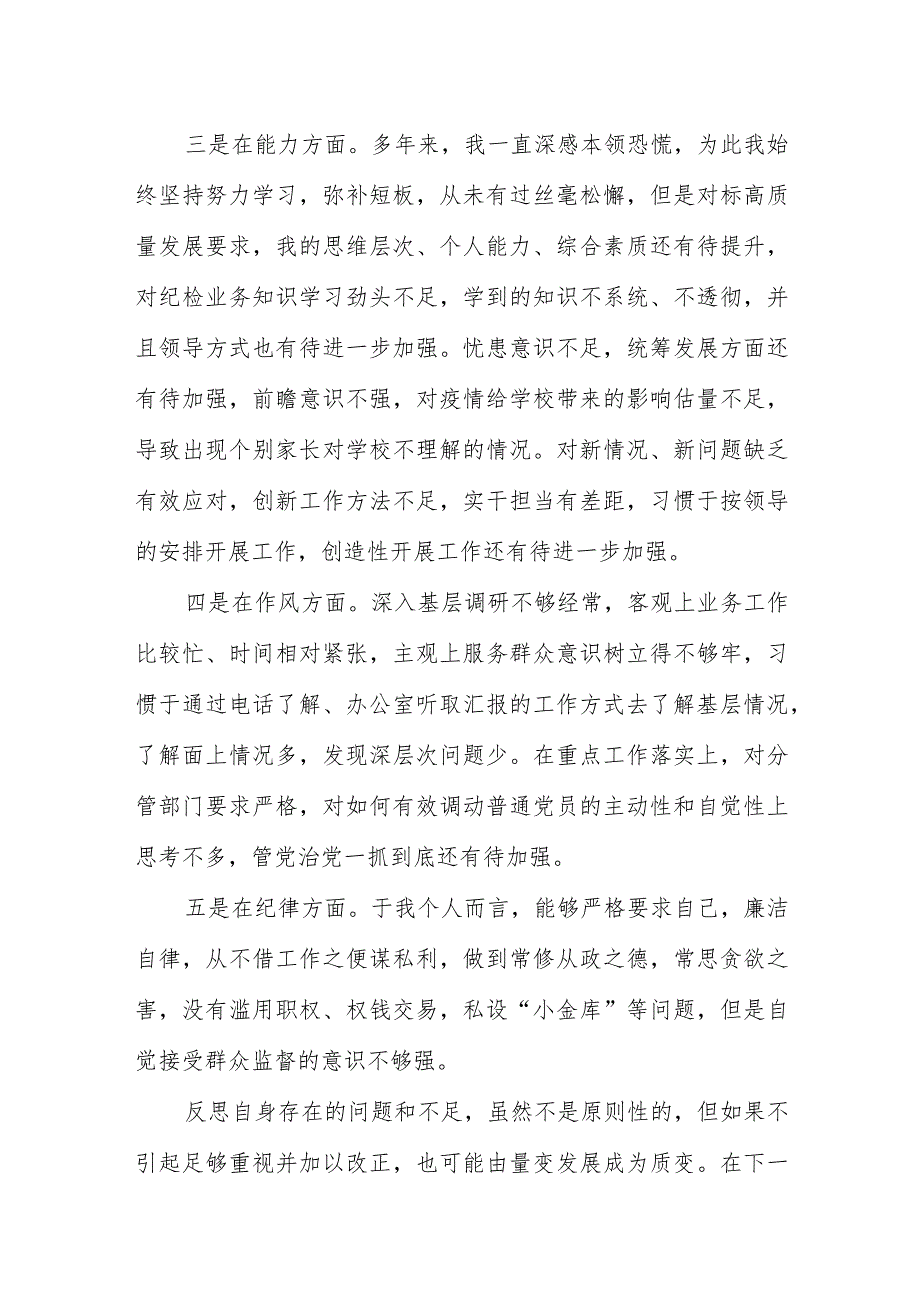 3、识不系统、不透彻,并且领导方式也有待进一步加强。忧患意识不足,统筹发展方面还有待加强,前瞻意识不强,对疫情给学校带来的影响估量不足,导致出现个别家长对学校不理解的情况。对新情况、新问题缺乏有效应对,创新工作方法不足,实干担当有差距,习惯于按领导的安排开展工作,创造性开展工作还有待进一步加强。四是在作风方面。深入基层调研不够经常,客观上业务工作比较忙、时间相对紧张,主观上服务群众意识树立得不够牢,习惯于通过电话了解、办公室听取汇报的工作方式去了解基层情况,了解面上情况多,发现深层次问题少。在重点工作落实上,对分管部门要求严格,对如何有效调动普通党员的主动性和自觉性上思考不多,管党治党一抓到底还有待加强。五是在纪律方面。于我个人而言,能够严格要求自己,廉洁自律,从不借工作之便谋私利,做到常修从政之德,常思贪欲之害,没有滥用职权、权钱交易,私设“小金库”等问题,但是自觉接受群众监督的意识不够强。反思自身存在的问题和不足,虽然不是原则性的,但如果不引起足够重视并加以改正,也可能由量变发展成为质变。在下一步工作中,我将采取有效措施,深入到基层中调研了解实际情况,使自己的立场更加坚定,思想更加解放,理论更加丰富,作风更加扎实,切实把心思凝聚到干事创业上,把精力集中到主责主业上,为推动学校高质量发展贡献更多力量。