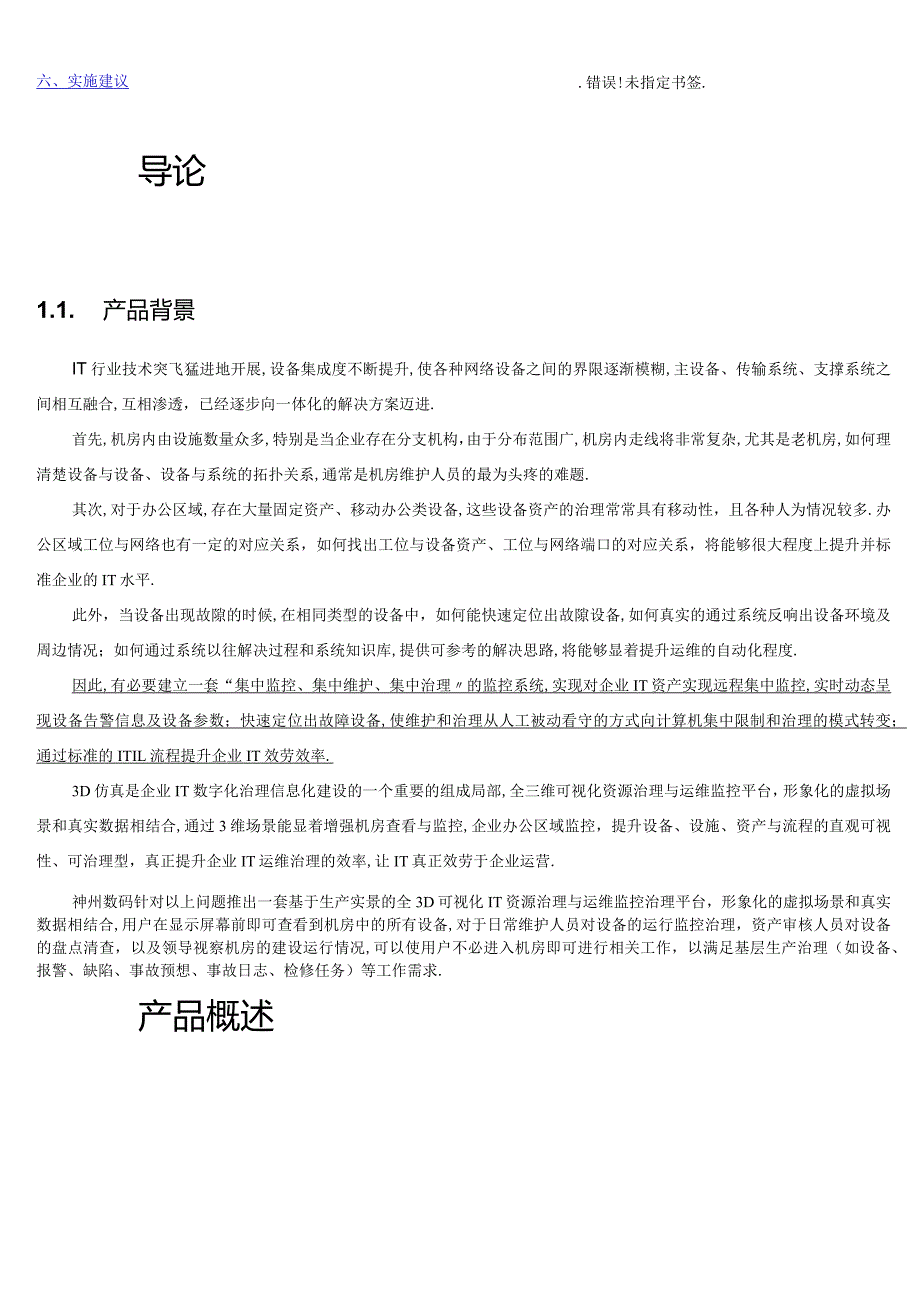 1、IT可视化综合运维治理解决方案SmartView产品技术白皮书V1.61版本号版本期修改人修改备注V1.02021-05-25常飕创立V1.52021-07-18常飕增加IT治理内容V1.62021-8-11常飓完善整体描述目录.错误!未指定书签.3.1.机房外GlS呈现.错误!未指定书签.六、实施建议导论1.1. 产品背景it行业技术突飞猛进地开展,设备集成度不断提升,使各种网络设备之间的界限逐渐模糊,主设备、传输系统、支撑系统之间相互融合,互相渗透,已经逐步向一体化的解决方案迈进.首先,机房内由设施数量众多,特别是当企业存在分支机构,由于分布范围广,机房内走线将非常复杂,尤其是老机房,如何