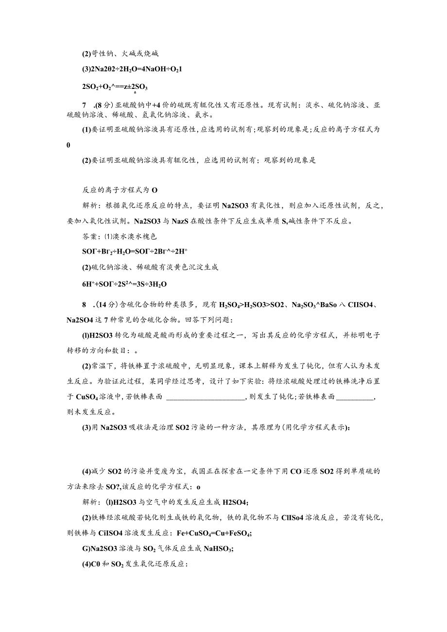 2、硫酸中混有的亚硫酸,应选用的最合理的氧化剂是()A.KMnO4B.Ca(CIO)2C.H2O2D.Cl2解析:H2O2的还原产物为HzO,其他氧化剂都会引入新的杂质。答案:C3. X(盐)和Y(酸)反应可放出有刺激性气味的气体Z,Z跟NaOH溶液反应又得到X(盐),Z氧化的最终产物为气体W,气体W溶于水又得到Y(酸)。则X(盐)和Y(酸)是()A.NazSCh和硫酸B.Na2SO3和盐酸C.Na2SO4和盐酸D.Na2SO3和硫酸解析:由题意可知,Y(酸)为含氧酸,X(盐)是一种弱酸盐,且X、Y、Z、W中应该含有同一种元素,由此可知,X和Y分别是Na2SO3和硫峻是正确的。答案:D4.双选题对