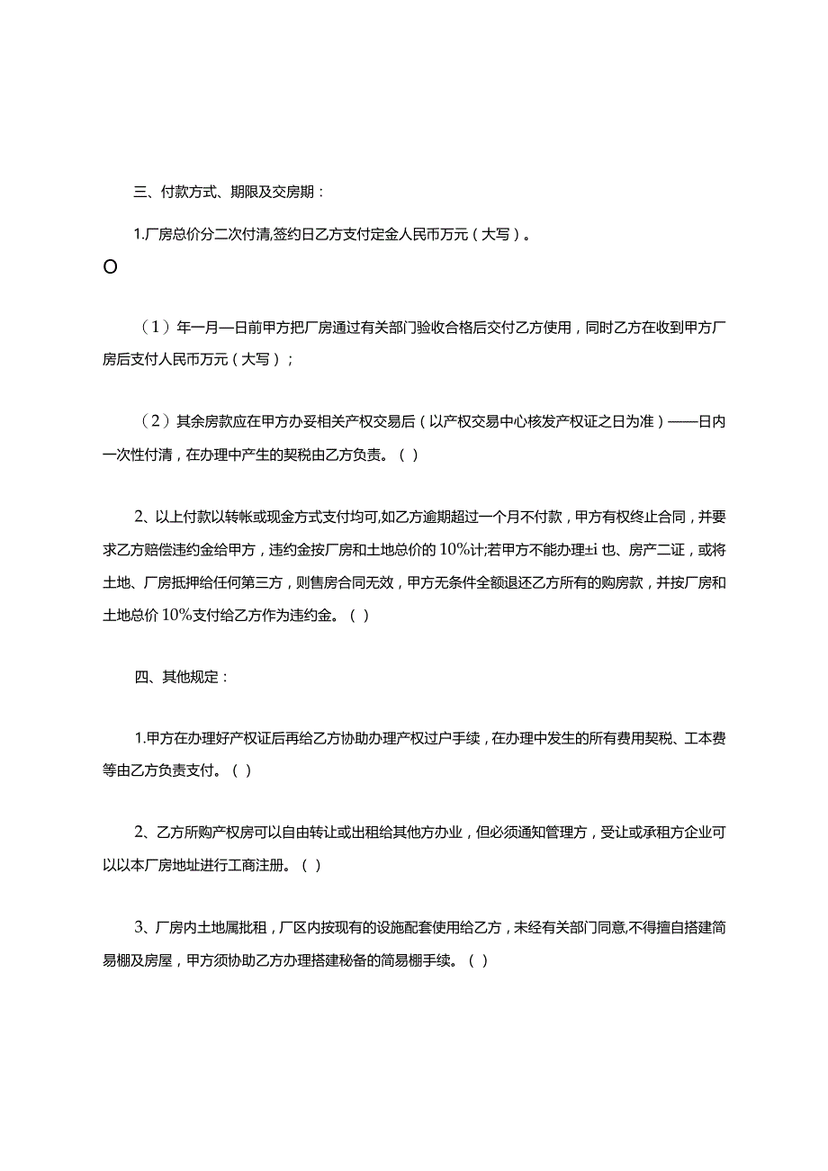 2、期:1.厂房总价分二次付清,签约日乙方支付定金人民币万元(大写)。O(1)年一月日前甲方把厂房通过有关部门验收合格后交付乙方使用,同时乙方在收到甲方厂房后支付人民币万元(大写);(2)其余房款应在甲方办妥相关产权交易后(以产权交易中心核发产权证之日为准)日内一次性付清,在办理中产生的契税由乙方负责。()2、以上付款以转帐或现金方式支付均可,如乙方逾期超过一个月不付款,甲方有权终止合同,并要求乙方赔偿违约金给甲方,违约金按厂房和土地总价的10%计;若甲方不能办理i也、房产二证,或将土地、厂房抵押给任何第三方,则售房合同无效,甲方无条件全额退还乙方所有的购房款,并按厂房和土地总价10%支付给乙方作