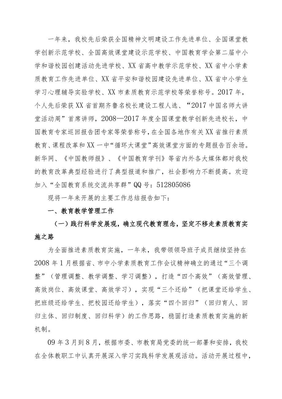 4、题报告百余场。新华网、中国教师报、中国教育学刊等省内外各大媒体都对我校的教育改革典型经验进行了典型报道和推广,社会影响力不断提高。欢迎加入“全国教育系统交流共享群”QQ号:512805086现将一年来开展的主要工作总结报告如下:一、教育教学管理工作(一)践行科学发展观,确立现代教育理念,坚定不移走素质教育实施之路为全面推进素质教育实施,一年来,我带领领导班子成员继续坚持在2008年1月根据省、市中小学素质教育工作会议精神确立的通过“三个调整”(管理调整、教学调整、学习调整),打造“四个高效”(高效管理、高效岗位、高效课堂、高效学习),实现“三个还给”(把课堂还给学生、把班级还给学生、把校园还给